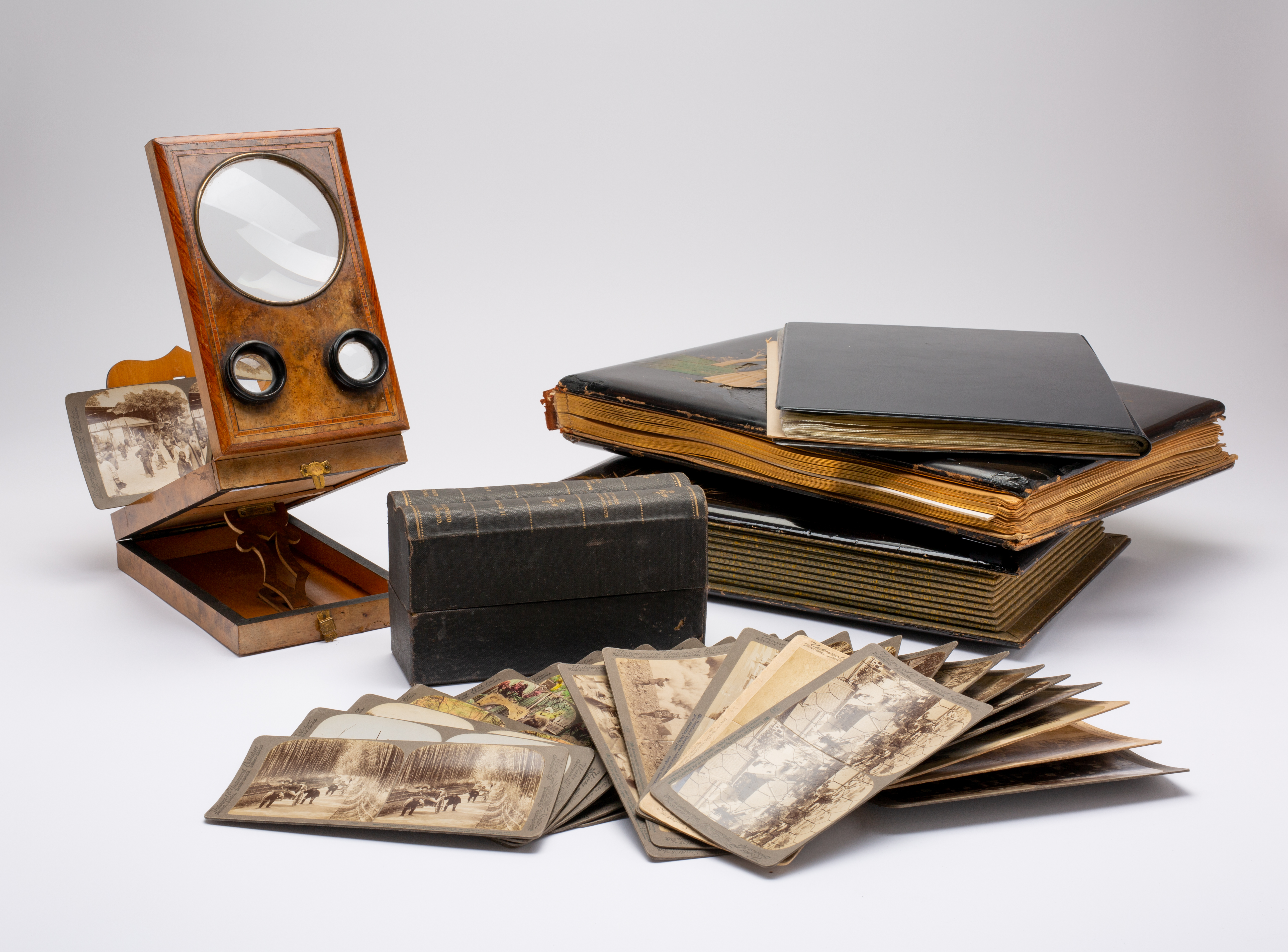 Comprising: four Japanese albums, two containing Yokohama shashin (early Japanese photographs), with staged studio images and views of Japan, some albumen silver hand-tinted pictures; and two containing Japanese postcards and other paper ephemera; one album of Chinese views; together with a collection of stereoviews of Japan, and a stereoscope. (a lot)