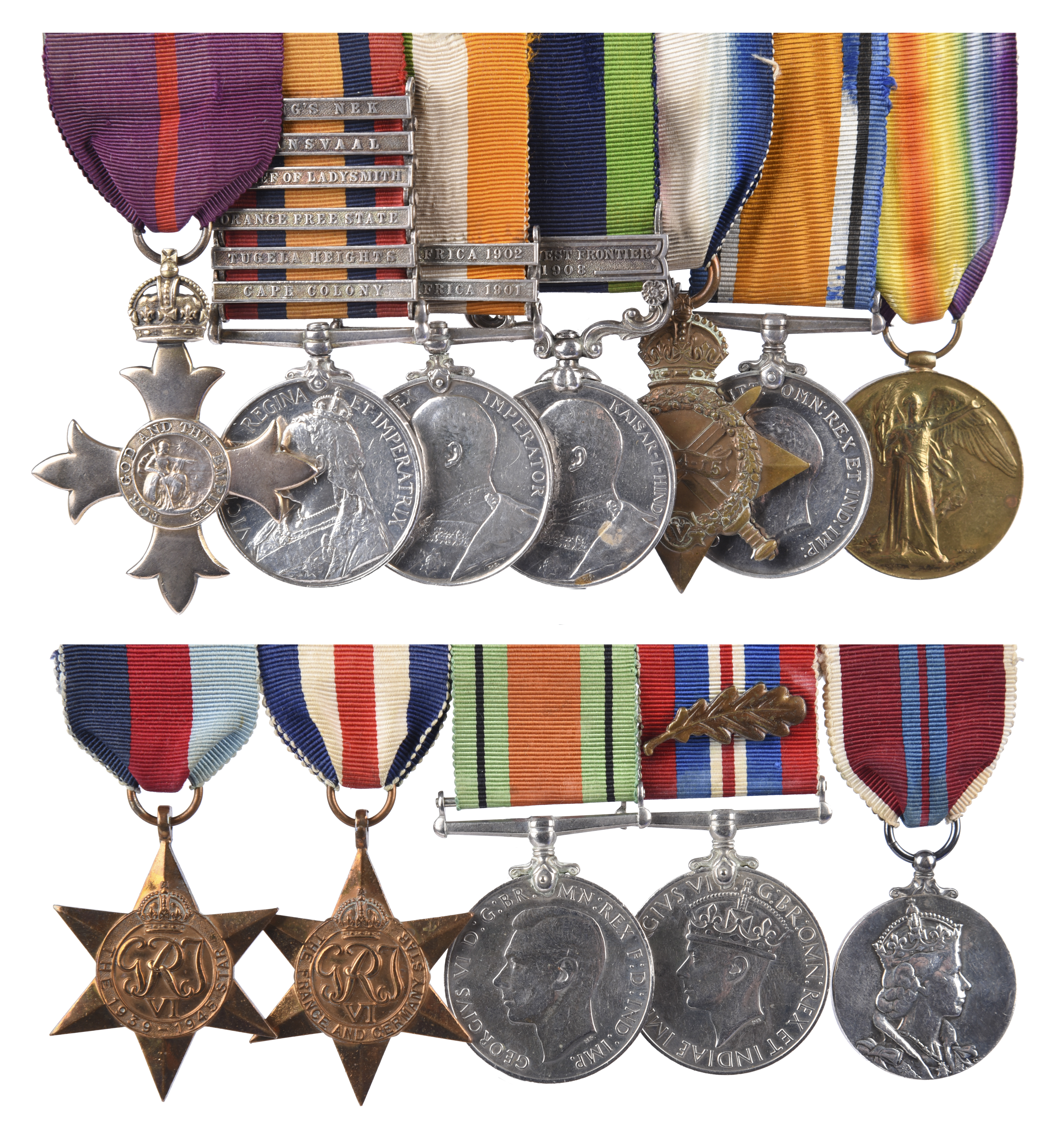 A family collection of medals, comprising: the O.B.E. group of seven awards to Captain (later Major) Malcolm Brown Bookey Riall, West Yorkshire Regiment: The Most Excellent Order of the British Empire, Military Division, officer's breast badge, Britannia type, London 1919; Queen's South Africa Medal, first type (b), ghost dates, 6* clasps: Cape Colony, Tugela Heights, Orange Free State, Relief of Ladysmith, Transvaal, Laing's Nek (Lieut. M.B.B. RIALL. W. York: Rgt.), engraved; King's South Africa, two dated clasps (Lieut. M.B.B. RIALL. W. York: Rgt.), engraved; India General Service Medal 1908-35, first type, clasp: North West Frontier 1908 (Captn. M.B.B. Riall. 1st W. Y. Rgt), engraved; 1914-15 Star (CAPT: M.B.B. RIALL. W. YORK. R.); British War Medal and Victory Medal (CAPT. M.B.B. RIALL.), mounted for wearing, QSA and KSA in particular with scratching to obverse fields, otherwise all very fine or better. [7]