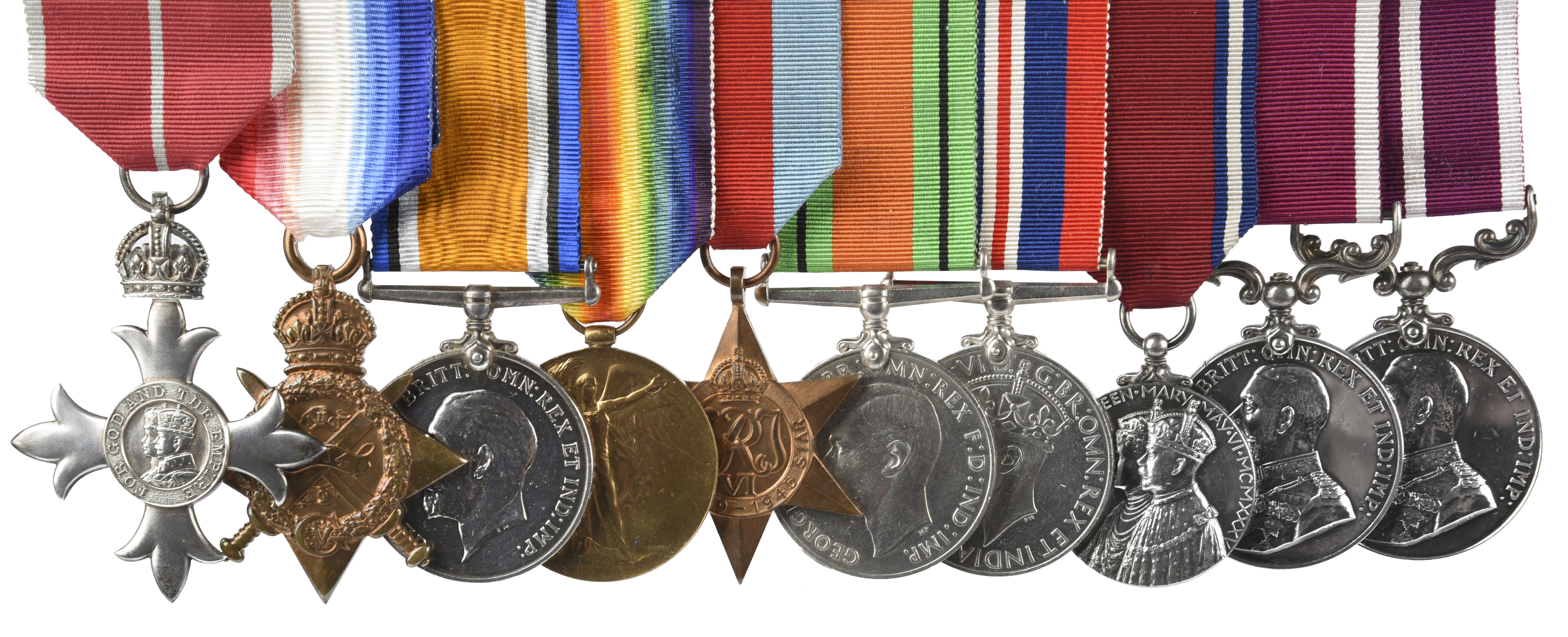The MBE and MSM group of ten awards to Foreman of Works (Staff Sergeant) and later Major Harry Vincent Hunt, Royal Engineers: The Most Excellent Order of the British Empire, Member's badge, 2nd type; 1914 Star (11347 F. OF W. S. SJT H. V. HUNT. R.E.); British War Medal 1914-20 and Victory Medal (11347 A.W.O. CL.2. H. V. HUNT. R.E.); 1939-45 Star, Defence Medal and War Medal; Jubilee Medal 1935, all unnamed as issued; Army Long Service and Good Conduct Medal, George V (1851435 T.W.O. CL.I. H. V. HUNT. R.E.); Meritorious Service Medal, George V (11347 F. OF W. Q.M. SJT H. V. HUNT. R.E.), display mounted and in a later case with insignia, very fine and better. [10]