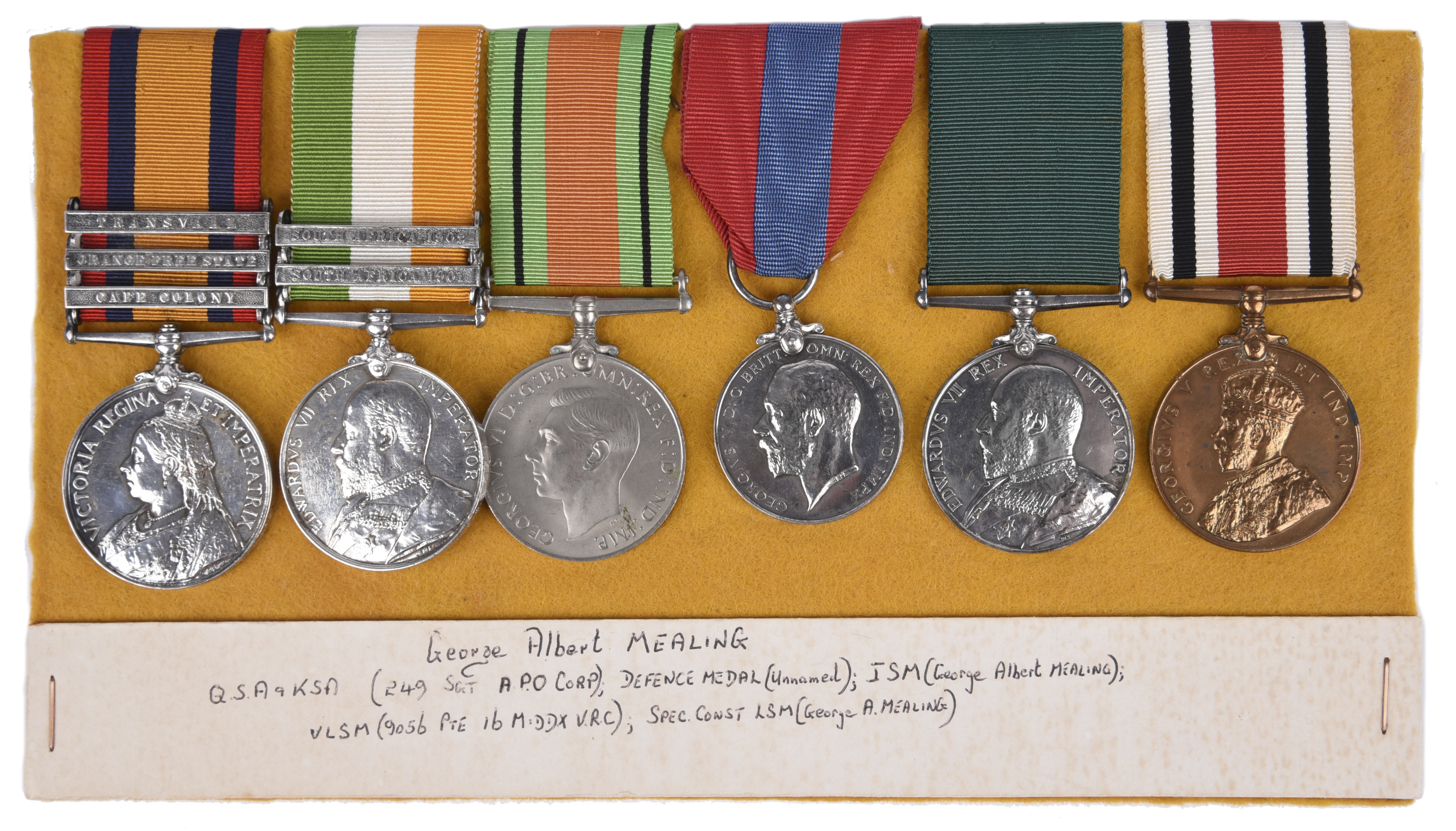 Six medals named or attributed to Sergeant George Albert Mealing, Army Post Office Corps and 16th Middlesex R.V.C.: Queen's South Africa, 2nd type, 3 clasps: Cape Colony, Orange Free State, Transvaal (249 SGT G. A. MEALING. A.P.O. CORPS); King's South Africa, two dated clasps (774 SERJT: G. A. MEALING. A.P.O.C.); Defence Medal (unnamed as issued); Imperial Service Medal, George V (GEORGE ALBERT MEALING.); Volunteer Long Service Medal, Edward VII (9056 PTE G. A. MEALING. 16 MIDDX: V.R.C.); Special Constabulary Long Service Medal, George V (GEORGE A. MEALING); nearly very fine and better. [6]