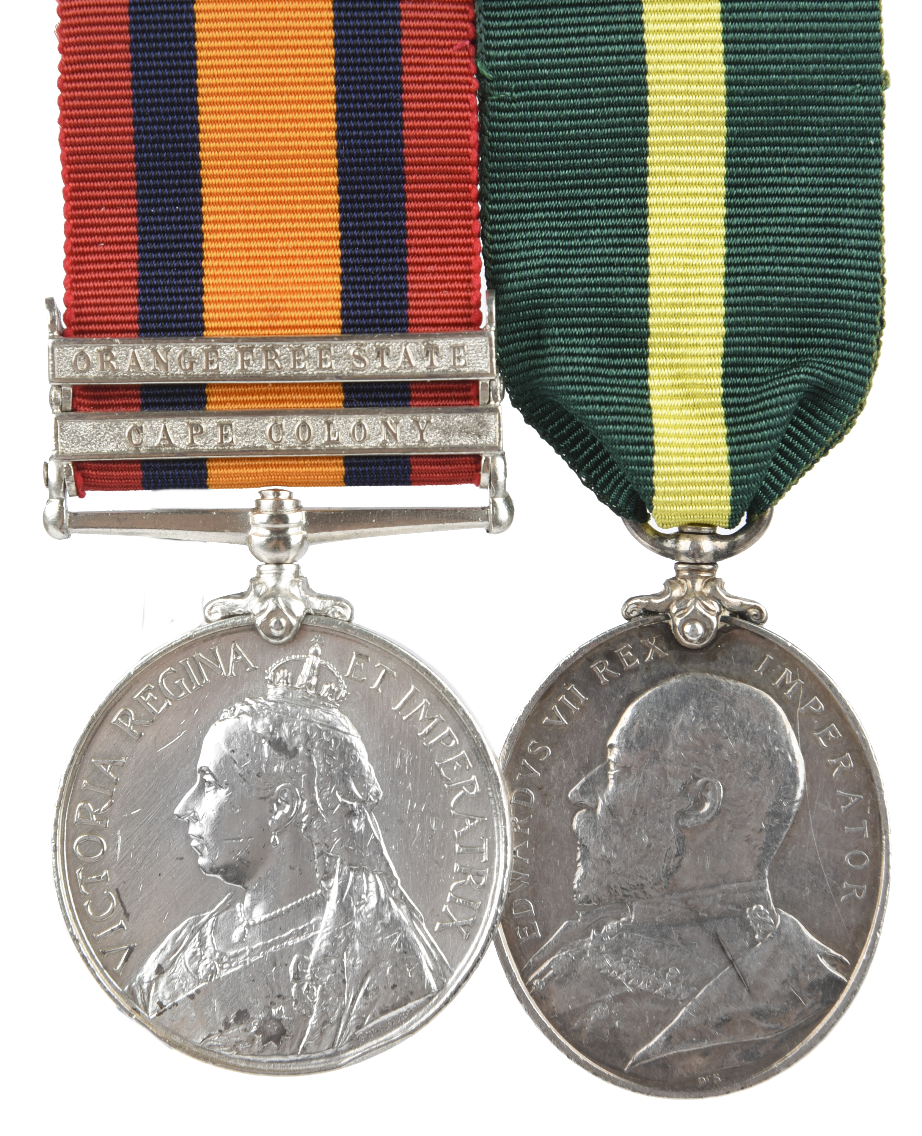 Two medals to Corporal A. B. Cox, City of London Imperial Volunteers and 18th London Regiment: Queen's South Africa, second type, 2 clasps: Cape Colony, Orange Free State (123 PTE A. B. COX, C.I.V.), plated, otherwise very fine; Territorial Force Efficiency Medal, Edward VII (172 CPL A.B. COX. 18/(C. OF L.) B. LON: REGT), good very fine; mounted by the late collector. [2]
