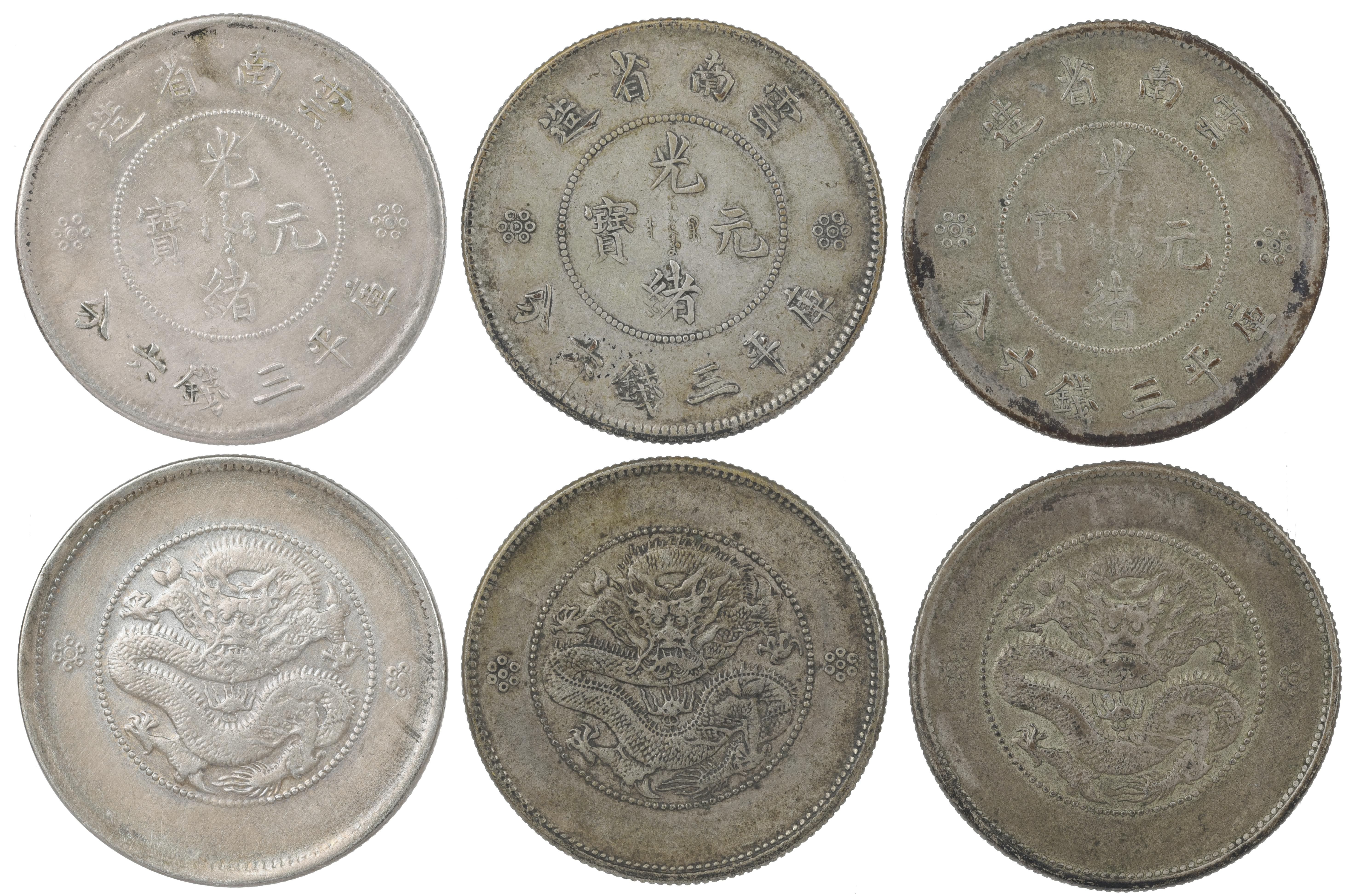 China - Republic: Yunnan, fifty cents (3), re-struck imperial coinage, Yunnan Sheng zao(Yün-nan Sheng Tsao), rev. dragon with two circles below pearl (KM Y257), two tarnished, all about very fine. [3]