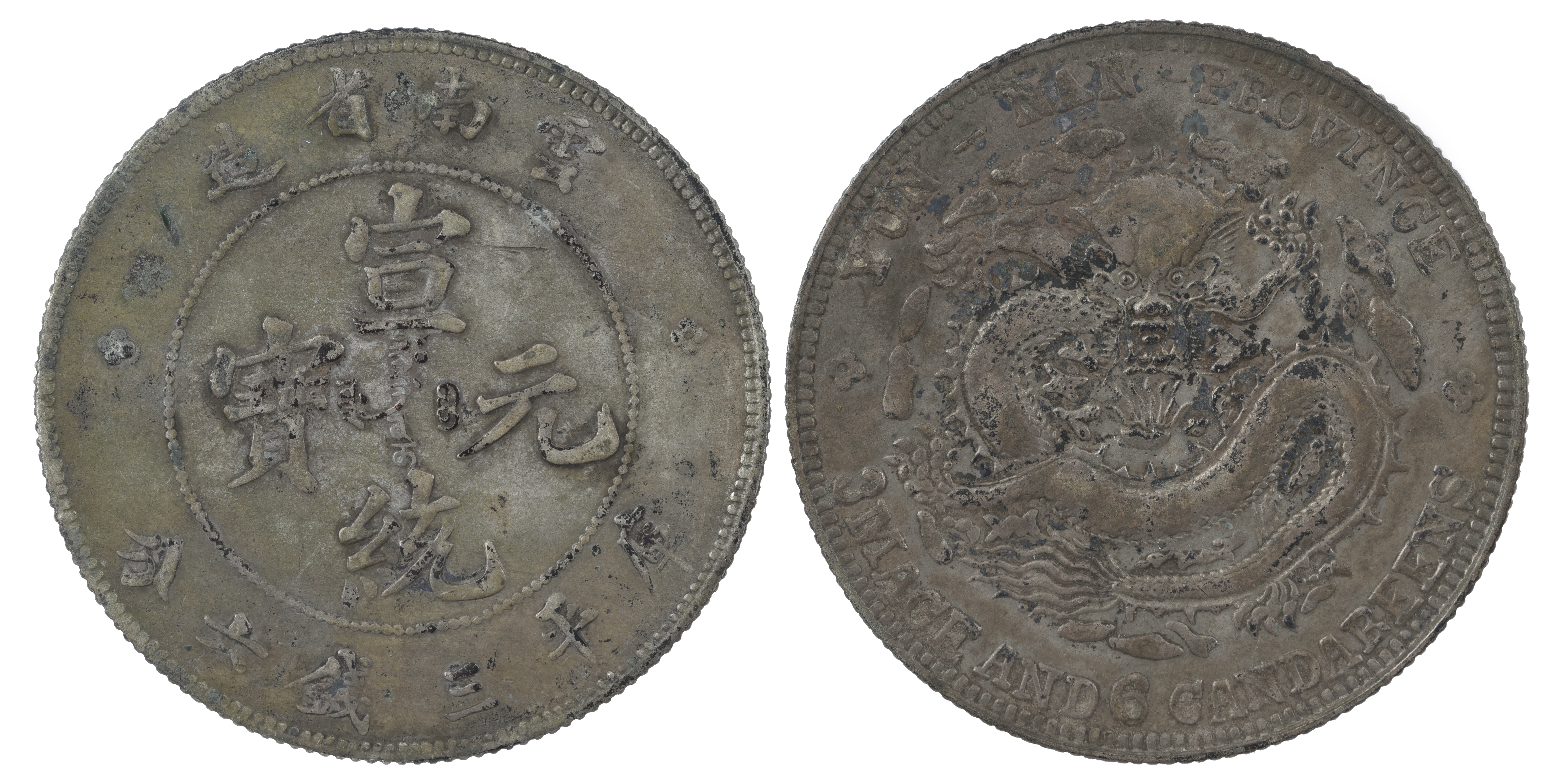 China - Empire: Yunnan, fifty cents, ND (1909-11), Xuantong yuenbao (Hsüan-t'ung-pao), rev. dragon with seven flames on pearl (KM Y259), dirty but about very fine.