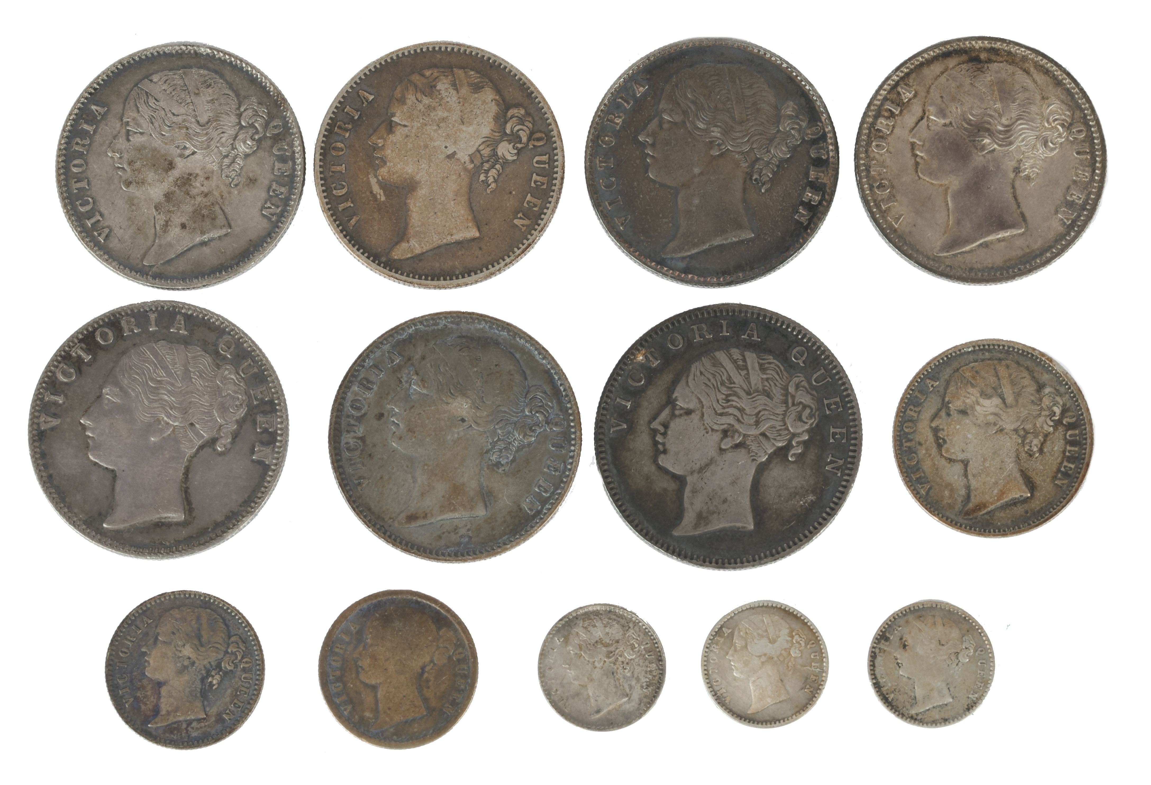 British India: Victoria, East India Company issues: silver rupee (7), 1840, various types, one fine, the rest good very fine or better; and a small quantity of lower denomination silver. [12]