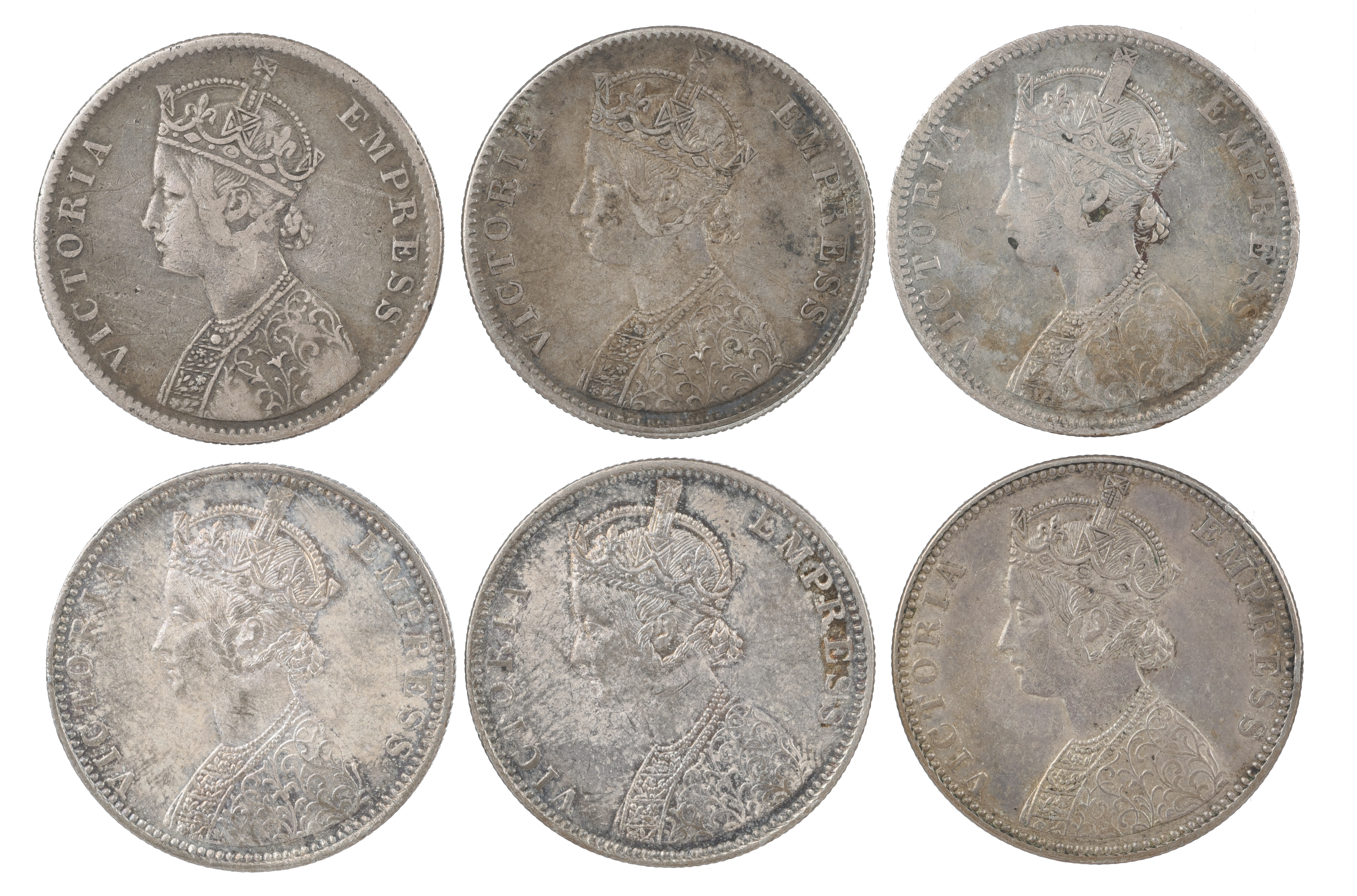 British India: Victoria, regal coinage, silver rupees: 1886, Calcutta, near very fine; 1887, Calcutta, about very fine; 1887, Bombay, raised mint mark, about very fine; 1888, Bombay, raised mint mark, nearly extremely fine; 1889, Bombay, incuse mint mark, bust C, reverse I, nearly extremely fine; 1890, Bombay, incuse mint mark, bust C, reverse I, about extremely fine. [6]