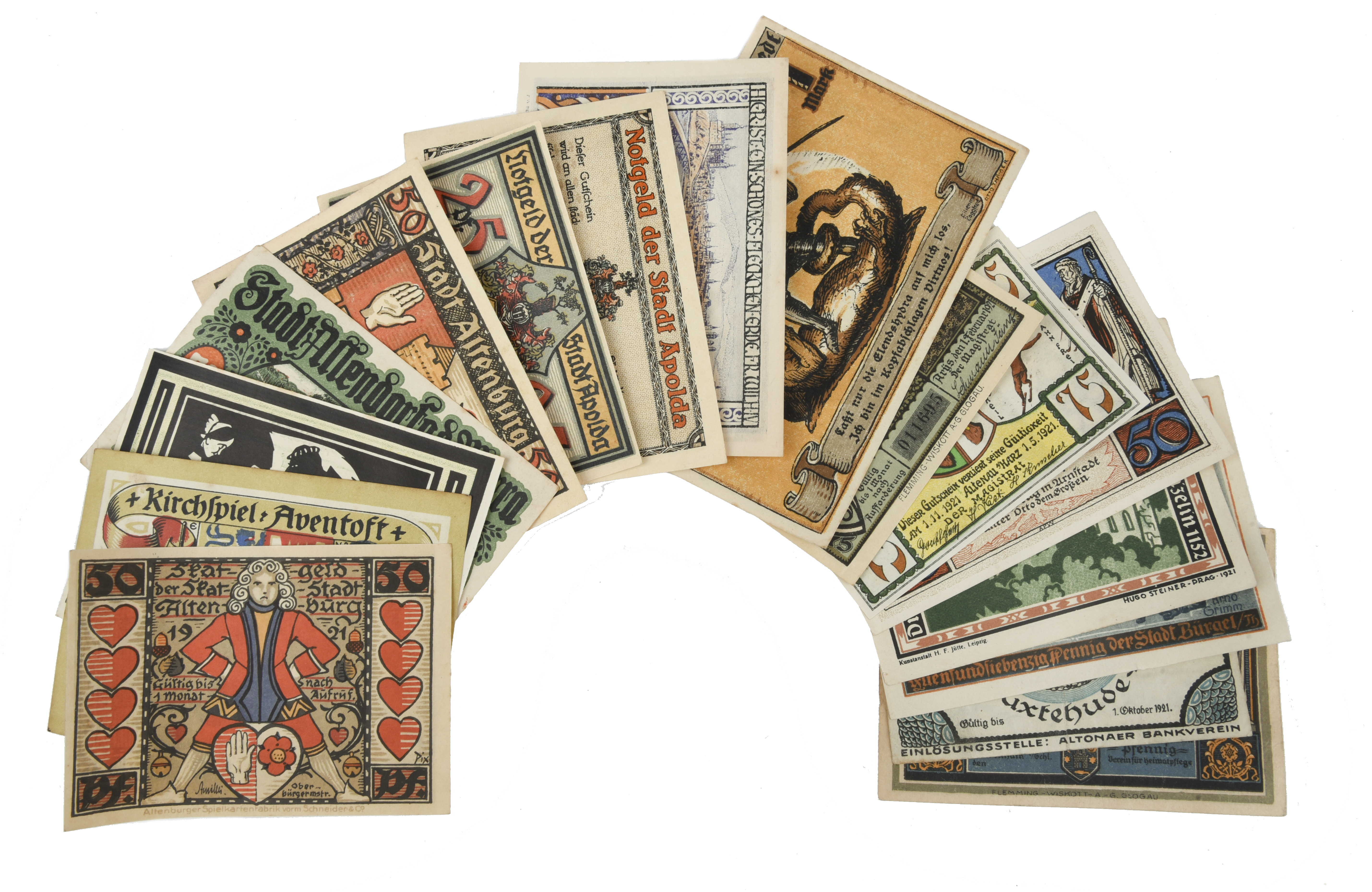 Germany: a quantity of paper notgeld, First World War and early 1920s dated issues, including some early wartime examples (August 1914) of monochrome non-pictorial type for Bielschowitz; other issuing localities including Altenburg, Apolda, Ahrensbök, Bitterfeld, Bad Godesberg and various other spa towns, and many others; a set of ten serienscheine from Detmold representing the Battle of the Teutoburger Forest (with envelope of issue); other themes including topography, folklore, and the health benefits of bathing (Bad Sulza); mainly in high grades. [circa 500]