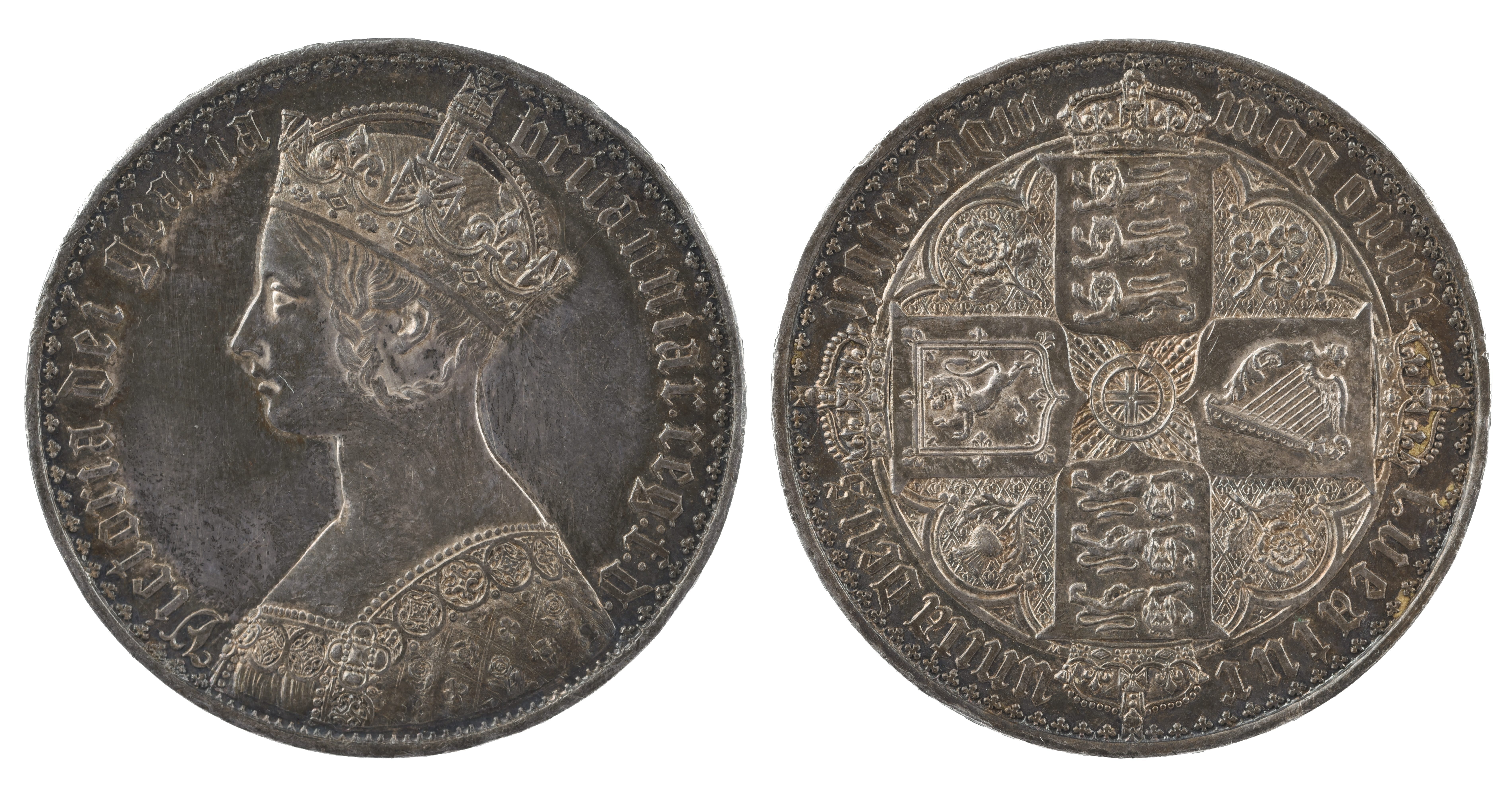 Victoria: silver crown, 1847, 'gothic' type, edge UNDECIMO (S 3883), light surface marks and small edge knocks, otherwise extremely fine and toned.