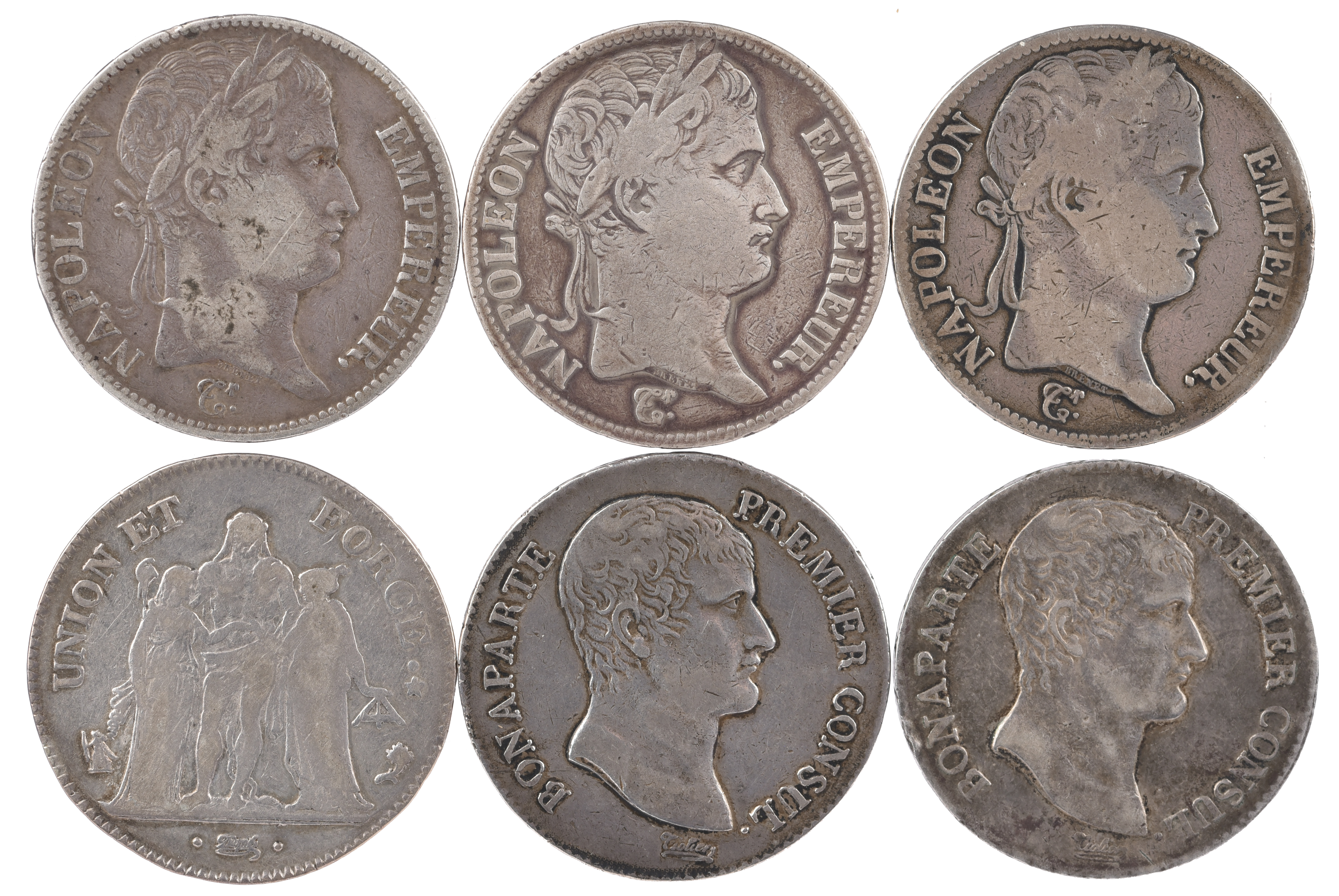 France - Republic: Napoleon as First Consul, silver five francs, AN 4 A (1795-96), Hercules group (KM 639.1), near fine; five francs, AN 12 A, AN 12 M, head right (KM 659.1, 659.10), near very fine; and Empire: Napoleon as Emperor, five francs, 1810 B, 1811 K, 1812 I, about fine. [6]