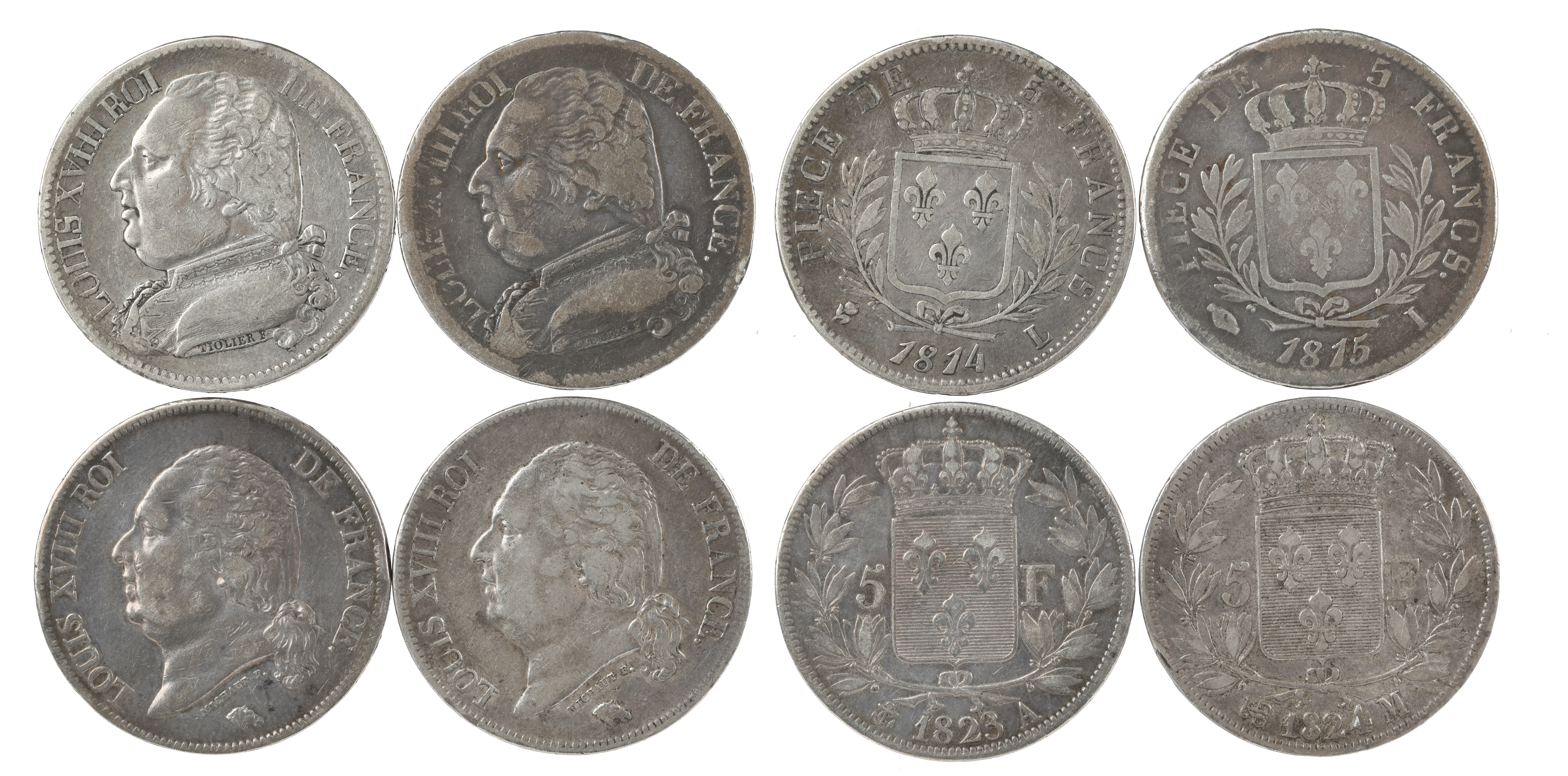 France - First Restoration: Louis XVIII, silver five francs (2), 1814 L, 1815 I (KM 702.8, 702.6), very fine and fine; together with, Second Kingdom: Louis XVIII, five francs (2), 1823 A, 1824 M (KM 711.1, 711.9), near very fine and better. [4]