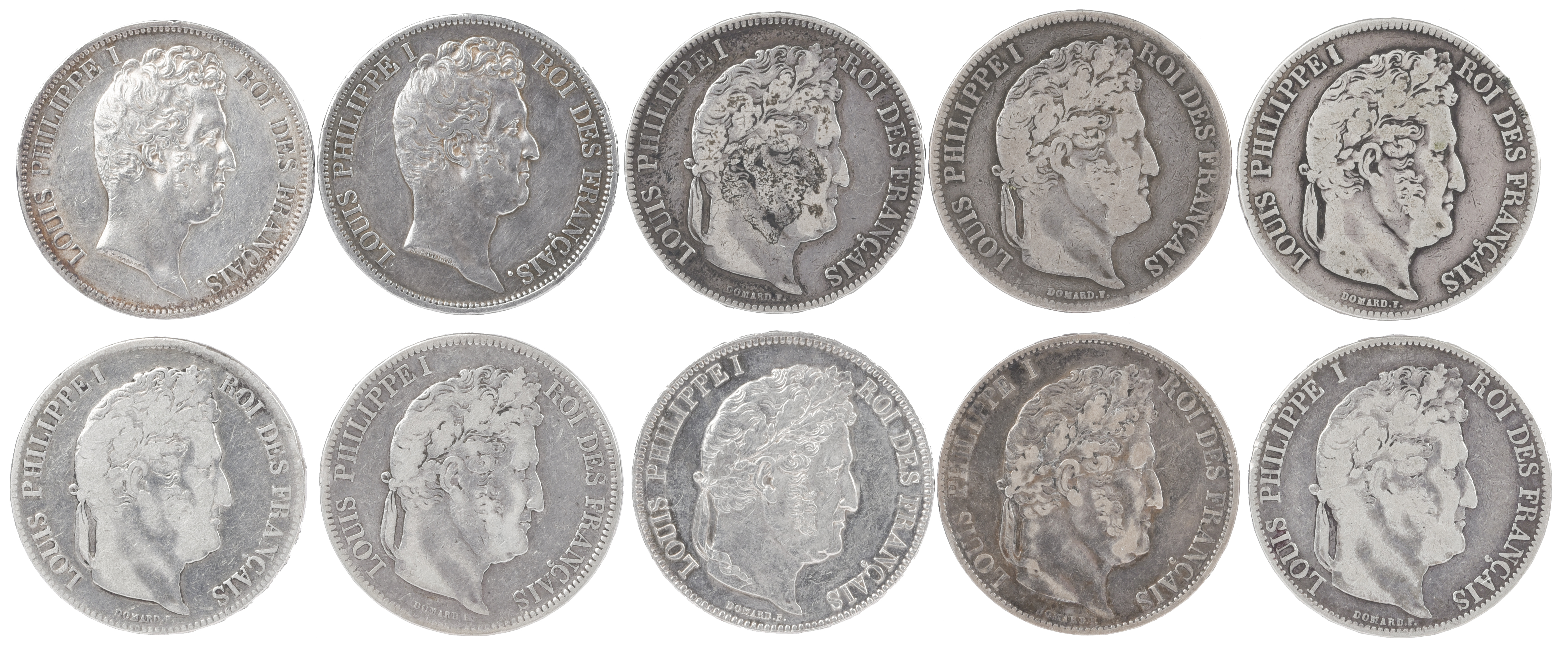 France - Second Kingdom: Louis Philippe, silver five francs (10), 1831 A, 1831 D, 1834 W, 1836 BB, 1837 B, 1838 B, 1841 W, 1843 W (this extremely fine), 1845 W, 1846 BB, from fine to very fine except where otherwise indicated. [10]