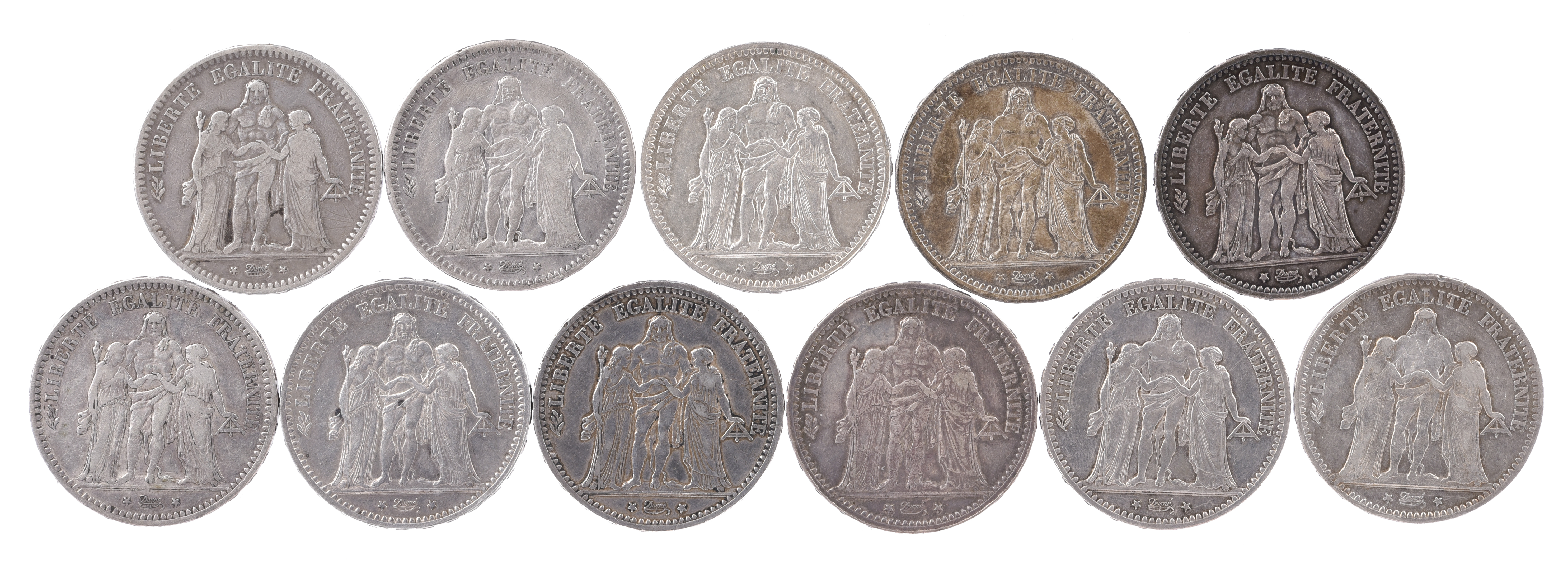 France - Second Republic: silver five francs, Hercules group, 1848 A, 1849 A (KM 756.1), near very fine; Third Republic: five francs (9), 1873 A (3), 1874 A, 1875 A, 1876 A (2) (KM 820.1), mainly extremely fine or nearly so; 1873 K, 1874 K (KM 820.2), very fine and better. [11]