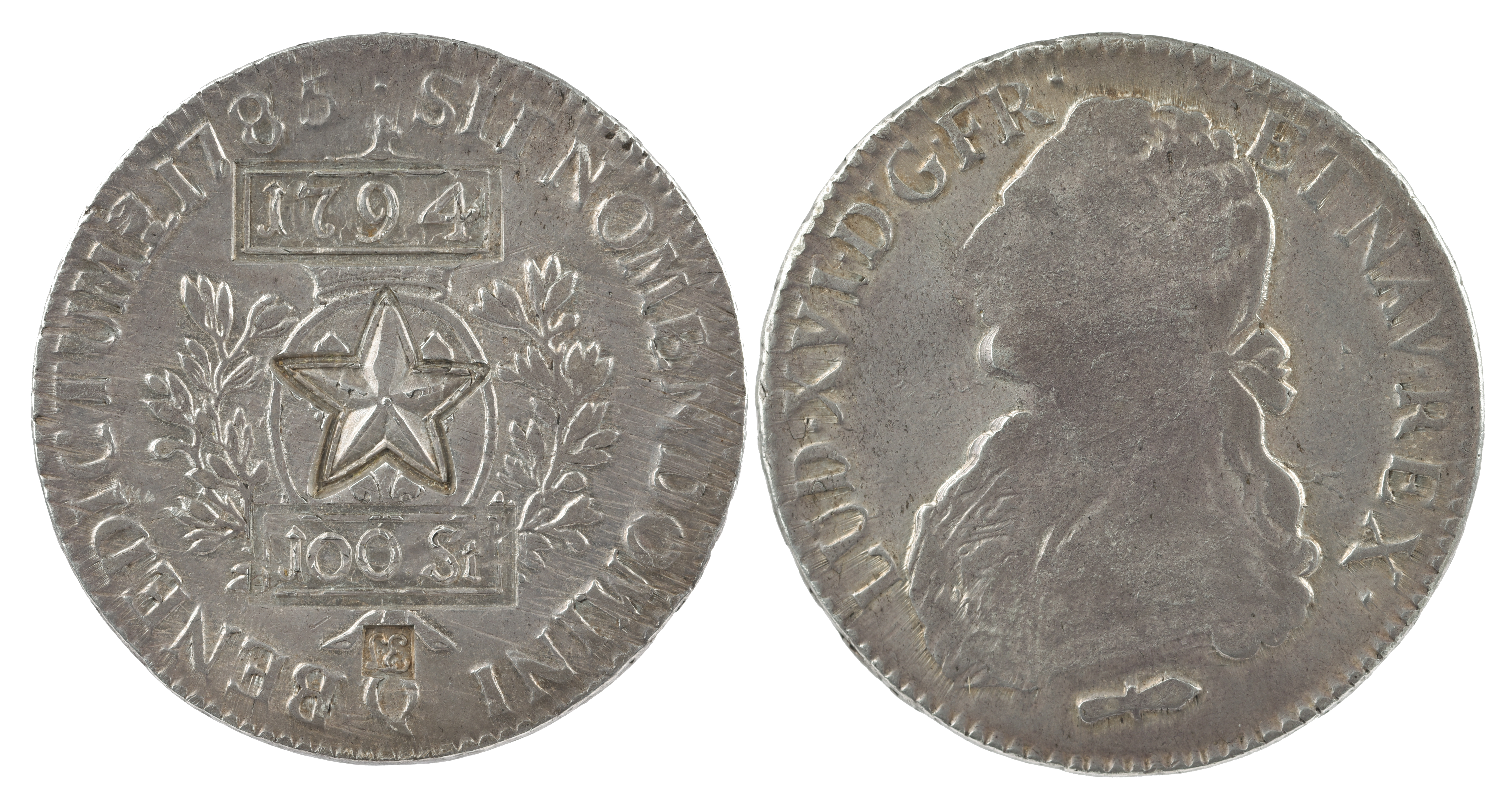 Netherlands: Maastricht: countermarked coinage, silver one hundred stuiver, 1794, countermarked on a French Ecu of Louis XVI, host date 1785 (KM 16), bust partly effaced, otherwise about very fine, rare.