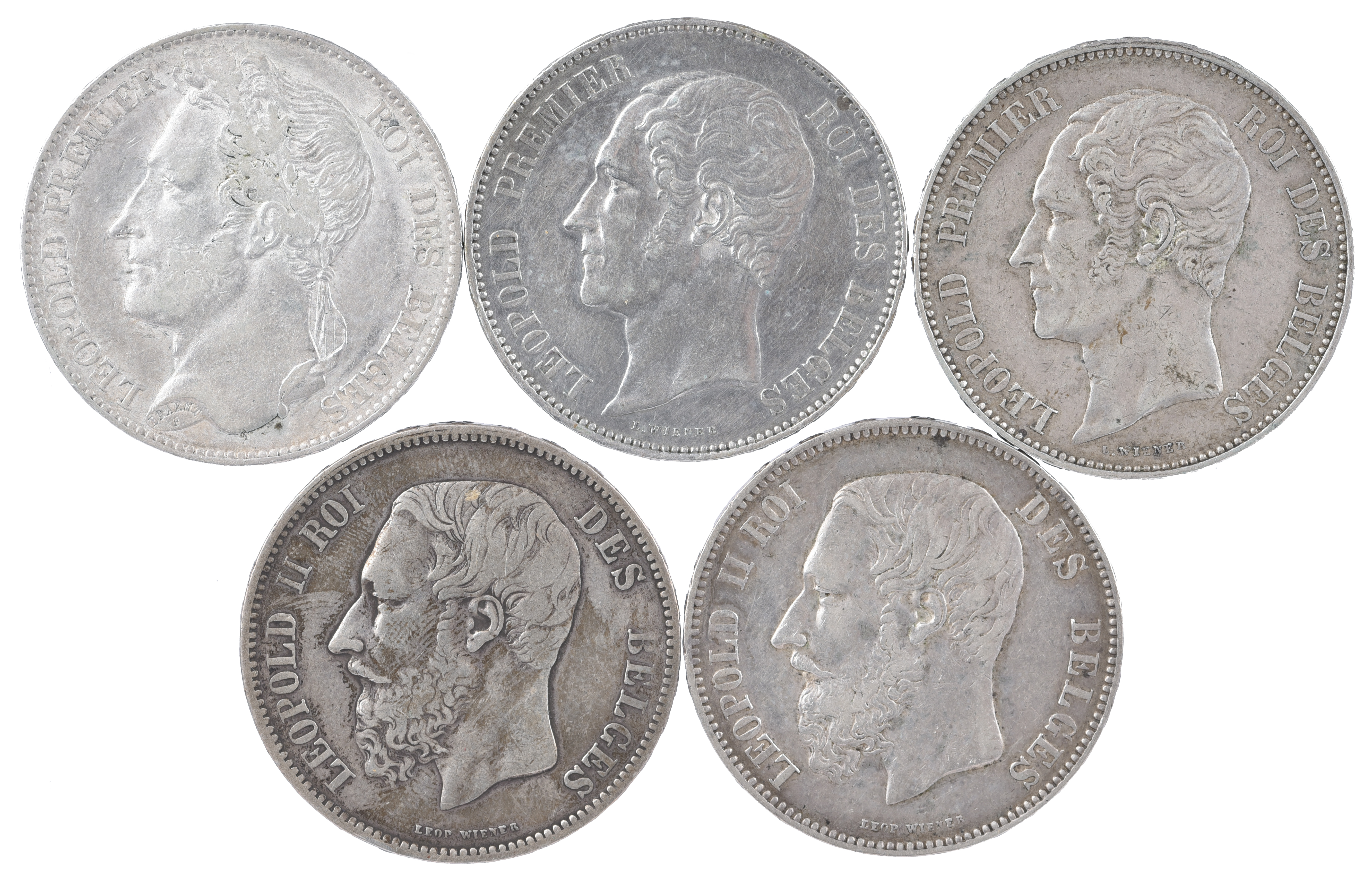 Belgium - Kingdom: Leopold I, silver five francs, 1848 (KM 3.2), good very fine; five francs, 1850, 1865 (KM 17), very fine; Leopold II, five francs, 1867, 1873 (KM 24), near very fine and extremely fine. [5]