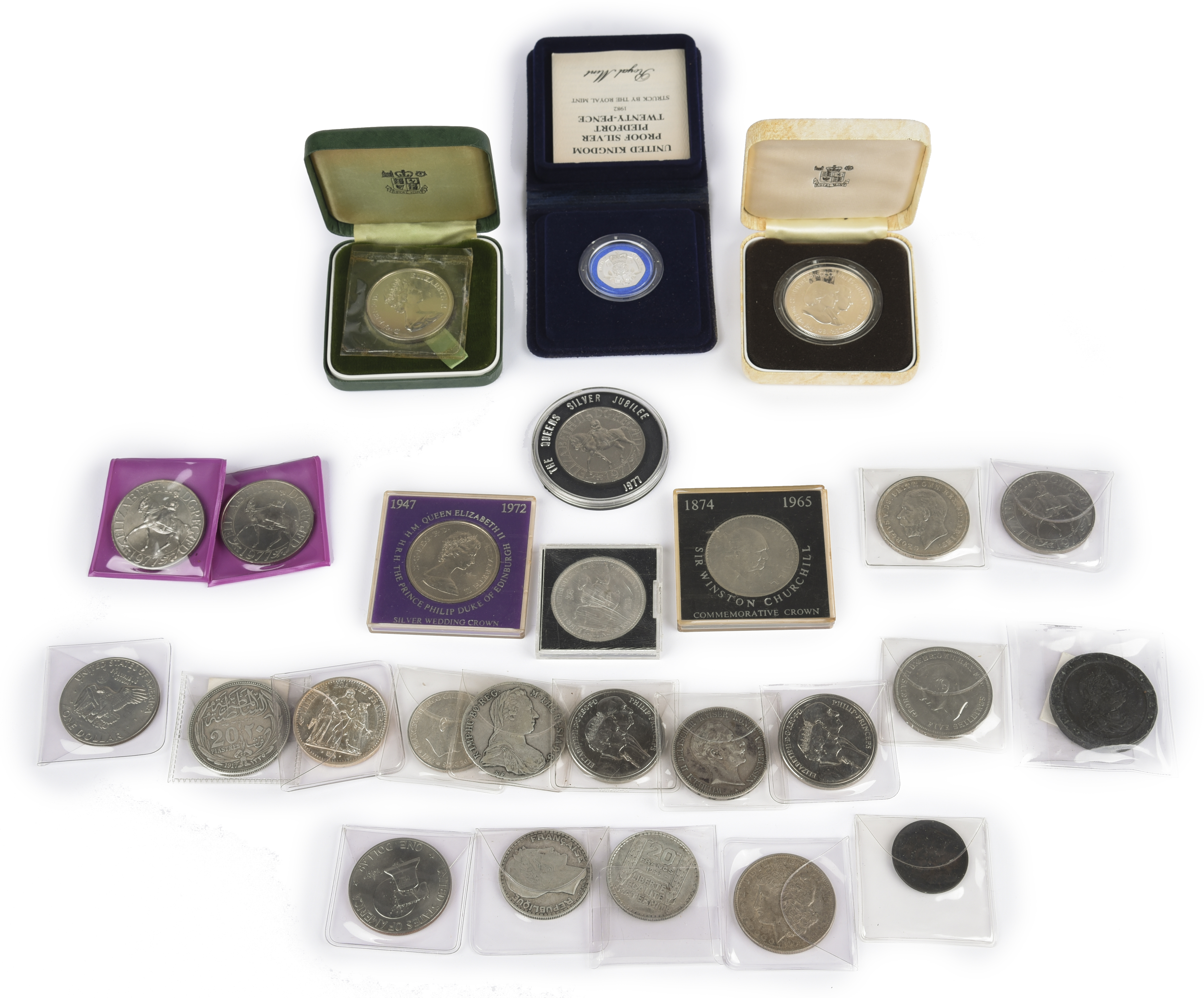 A quantity of the coins of various nations, many of them crowns and equivalents, circulating and commemorative issues, including: Great Britain: George V, crown, 1935 (S 4048), extremely fine; Germany - Prussia: William II, five marks, 1904 (KM 523), very fine; United States of America, dollar, 1921 D, 'Morgan' type (KM 110), nearly extremely fine; Falkland Islands, silver commemorative proof fifty pence, 1981, Charles and Diana, cased, about as struck; and various others. [qty]