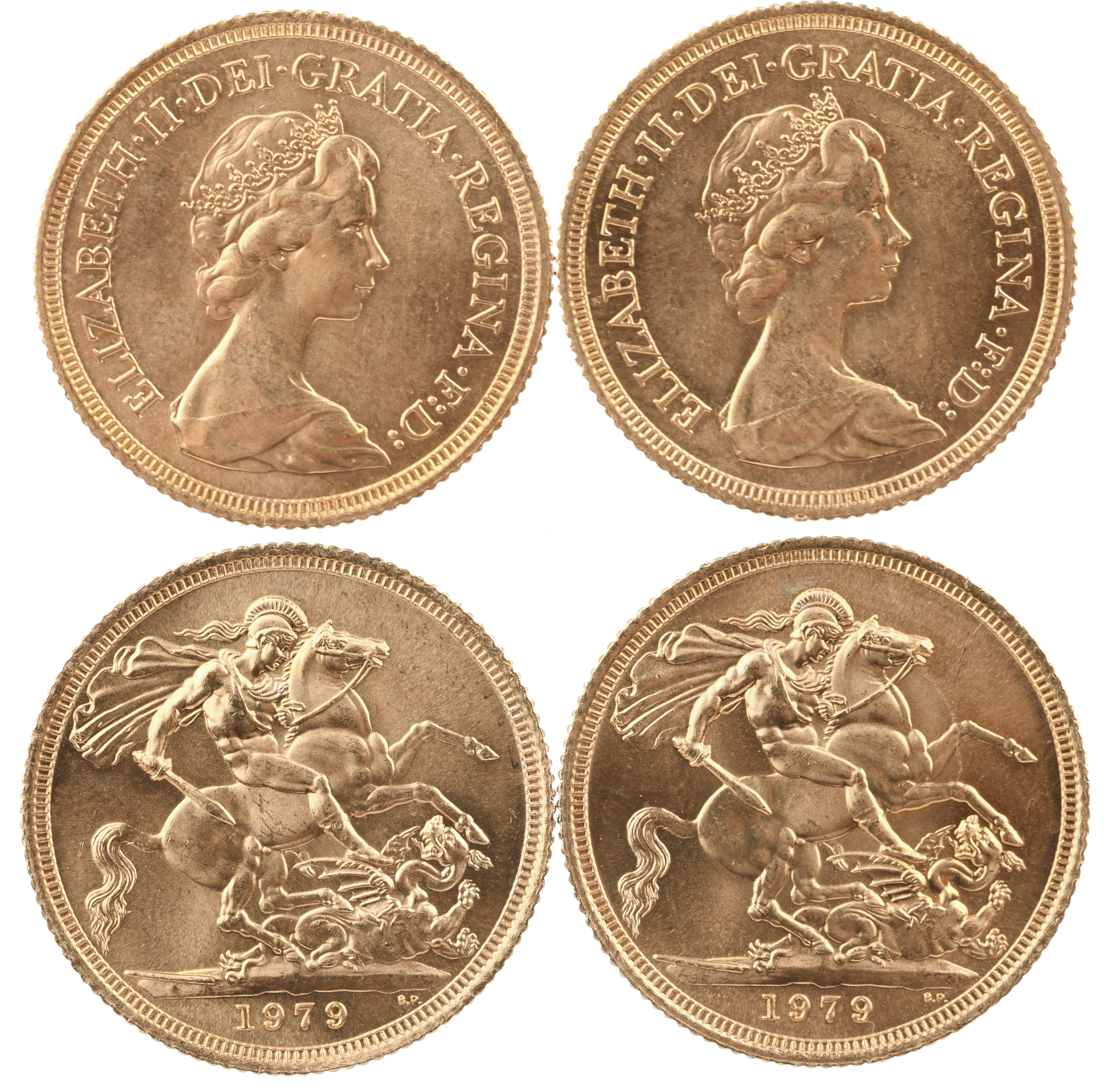 Elizabeth II, gold sovereigns (2), 1979 (S 4204), about extremely fine. [2]