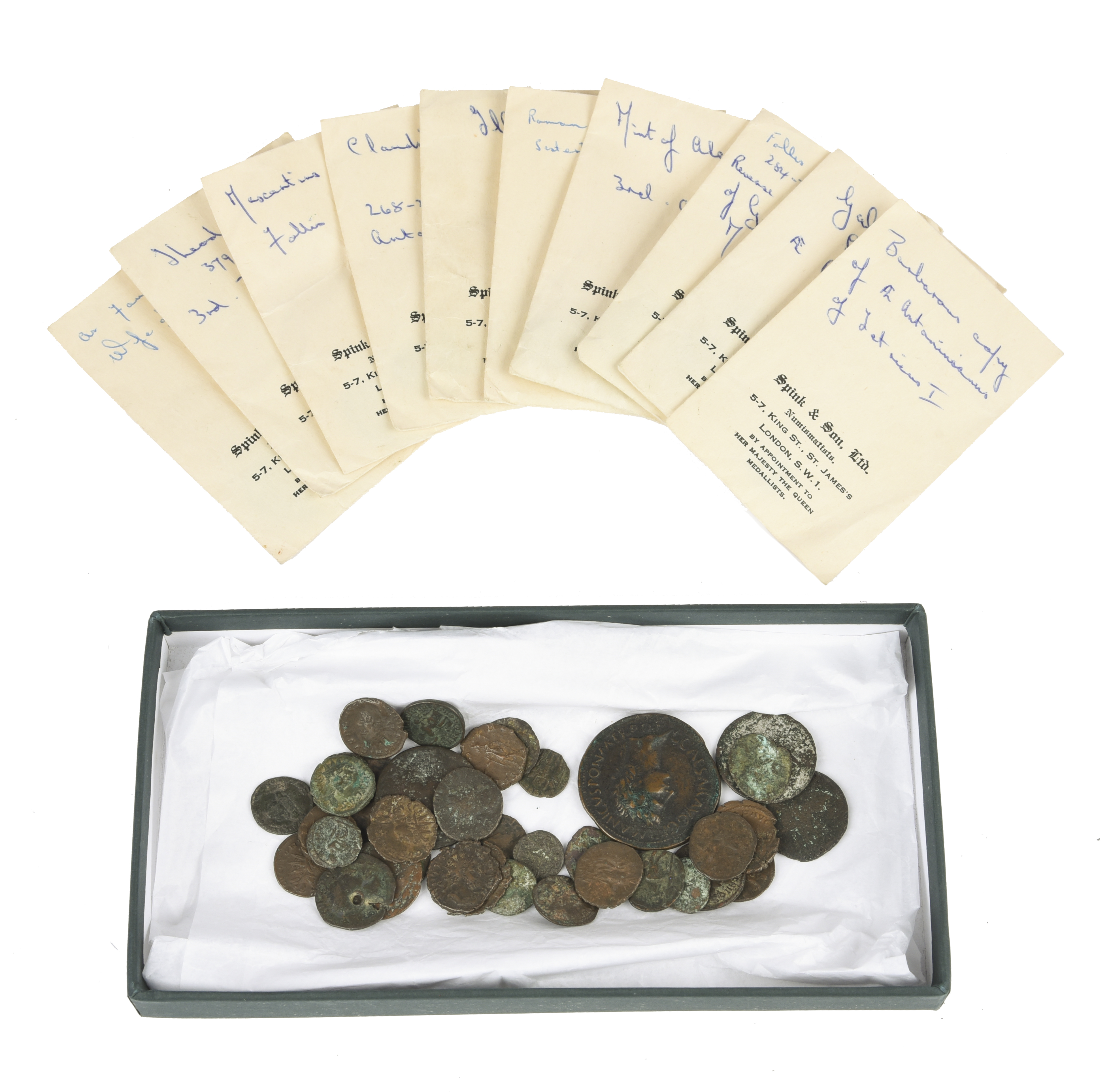 Rome - Empire: a quantity of bronze coins, various rulers and denominations, including: Diocletian (284-305), follis, laureate head right, rev. standing figure with patera and cornucopia; Gallienus (254-268), antoninianus, radiate head right, rev. Uberitas stading with purse and cornucopia, epsilon to right; Faustina I (wife of Antoninus Pius), as, head right, rev. Eternity standing, S C divided in field; and various others including radiates, AE2, AE3 &c., some in old Spink envelopes, varied states. [qty]
