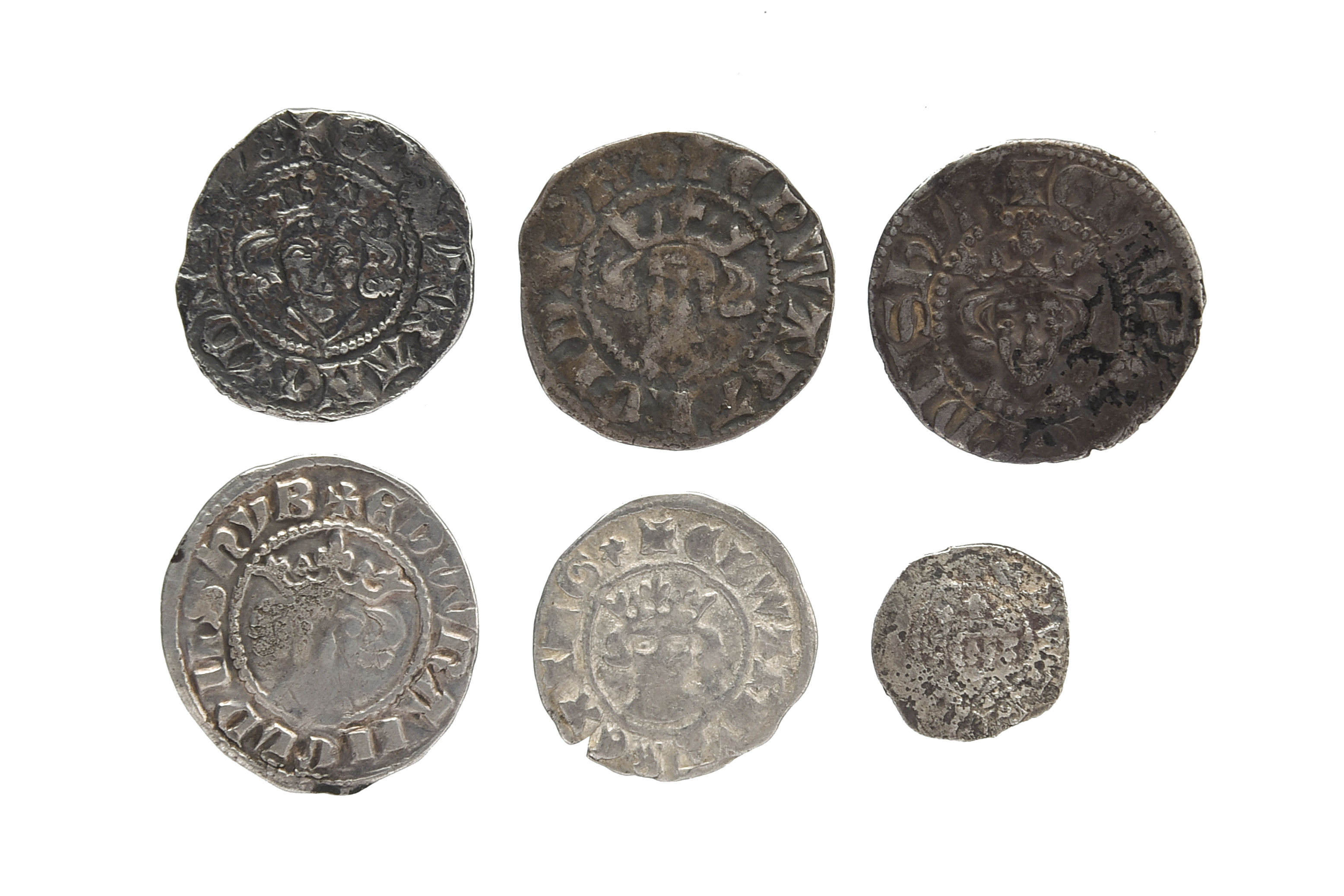 Edward I (1272-1307), new coinage (from 1279), a small collection of silver coins, comprising: penny, London, 1.33g, clearly clipped, otherwise about fine; penny, Canterbury, 1.36g, fine; penny, Durham, 1.33g, edge nick, otherwise better than fine; penny, Newcastle, 1.32g, near fine; halfpenny, 0.61g, clipped, near fine; farthing, 0.29g, fair. [6]
