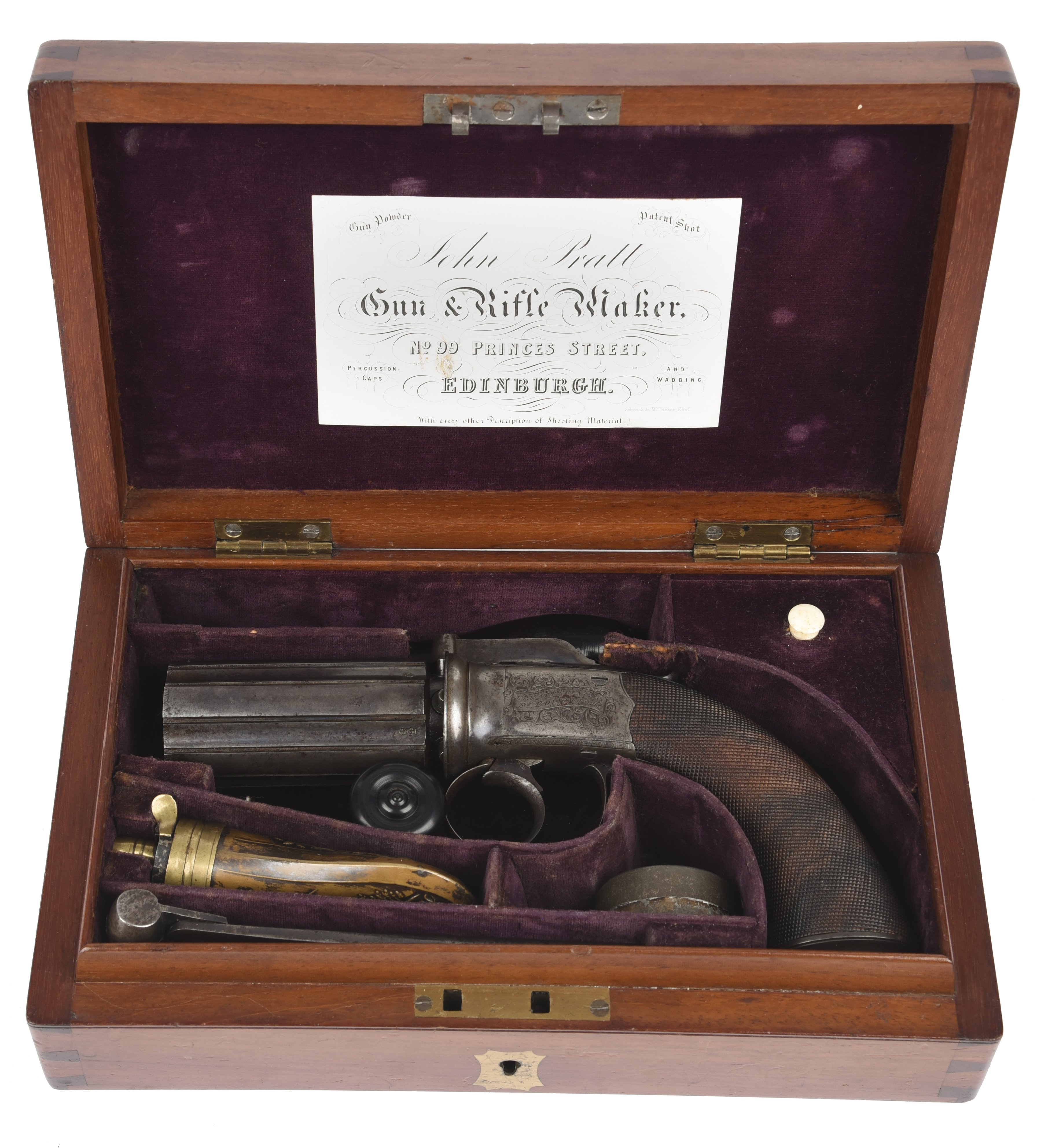 A British six shot 'pepperbox' percussion revolver, fluted cylinder 3 in., London Company proof marks, scroll engraved frame with retailer's details 'J. PRATT, PRINCES STREET, EDINBURGH', bar hammer engraved with chevrons and a star, sliding safety bar, chequered grip with vacant silver escutcheon, engraved steel butt trap; in a fitted case with combined bullet mould/loading rod, pistol powder flask, ebony wad box, and nipple key, Pratt trade label to lid - possibly later.