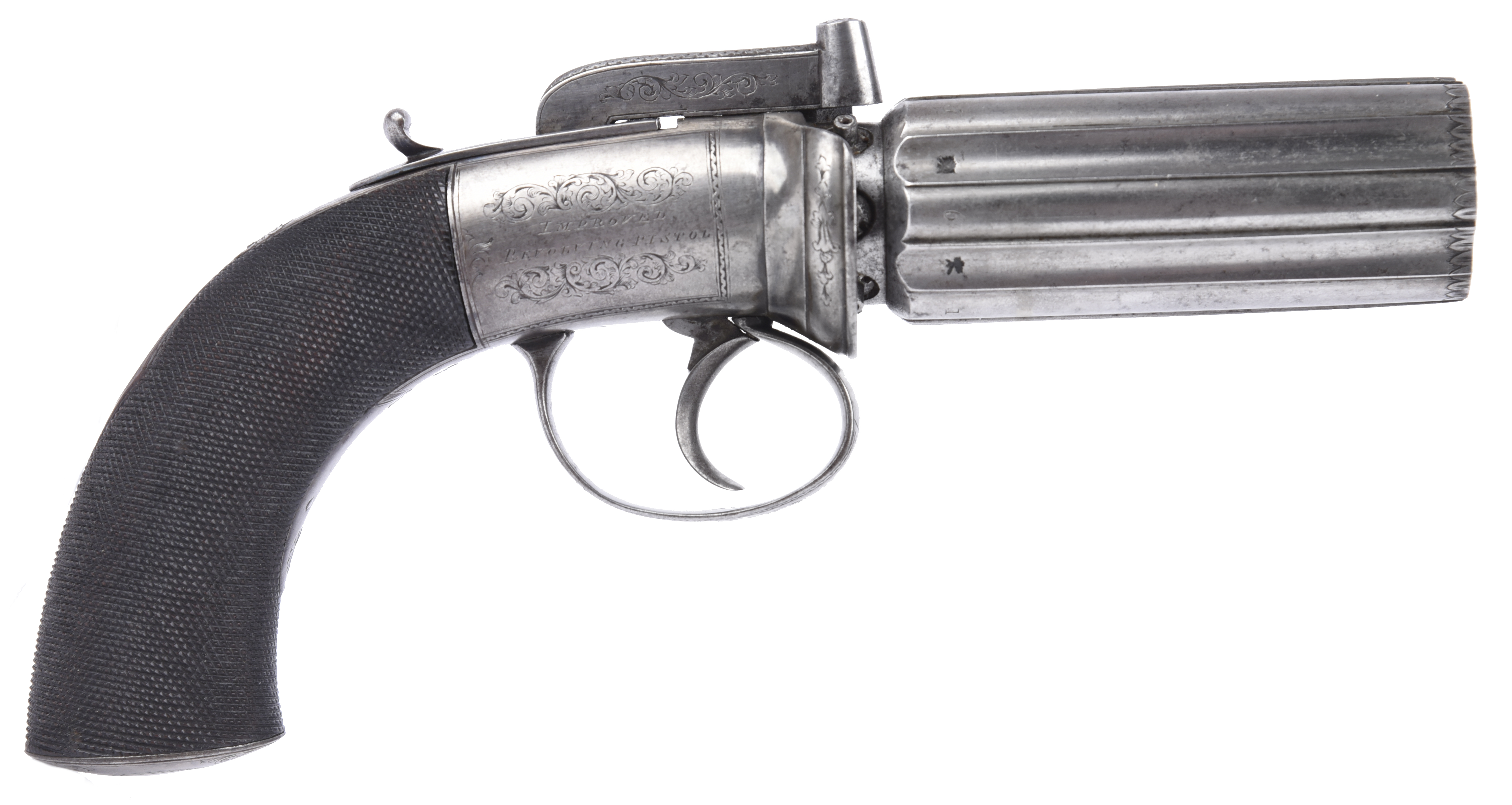 An English 84 bore six shot 'pepperbox' percussion revolver, by or for W. Richards, cylinder 3.5 in., with numbered barrels, engraved band at the muzzles, Birmingham proof, round action engraved with acanthus scrolls and 'W. RICHARDS LONDON / IMPROVED REVOLVING PISTOL', bar hammer with safety bolt, chequered wooden grip, engraved steel butt trap; in a fitted case with bullet mould and loading rod.