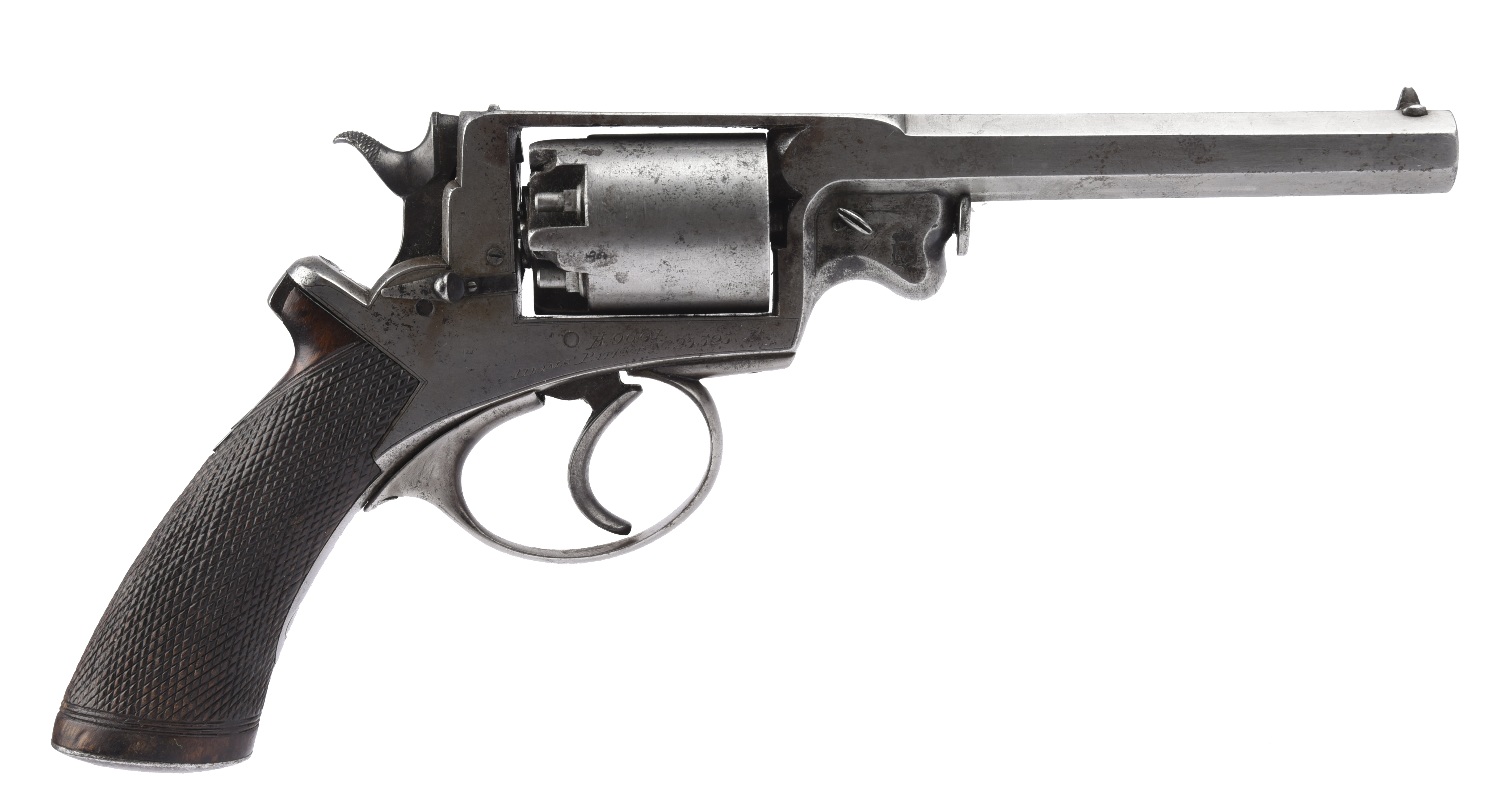 London Armoury Company: a 54 bore Beaumont-Adams five shot percussion revolver, hexagonal barrel 5.75 in., top of frame engraved 'ROBERT ADAMS LONDON', frame numbered B.9661, LAC crowned shieldmark to under barrel lug, chequered grip.