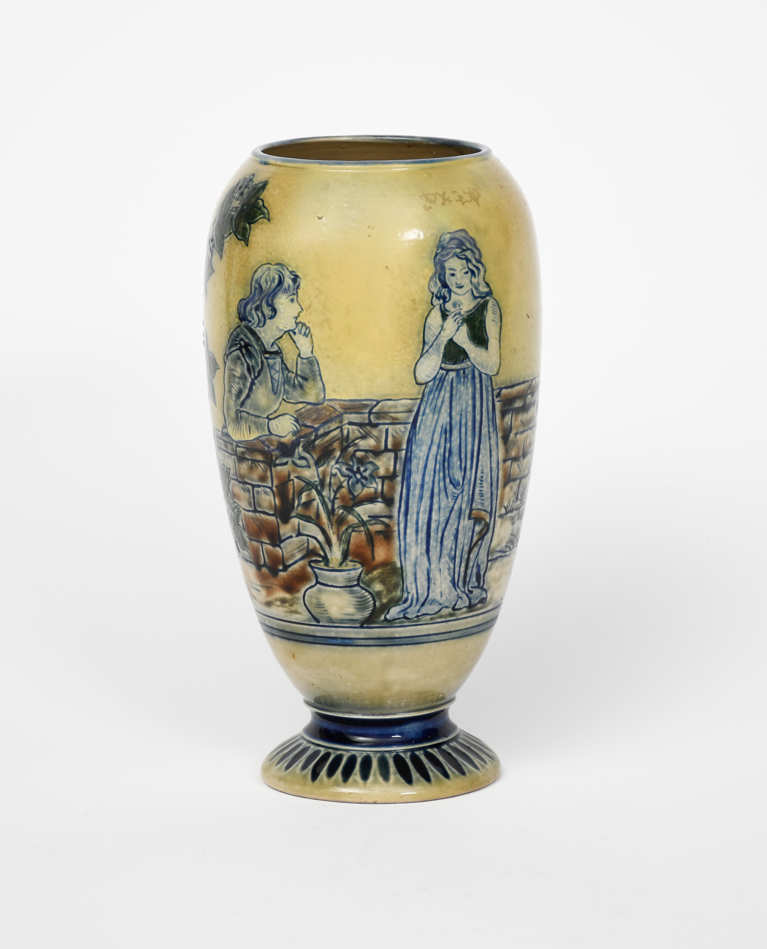 A Martin Brothers stoneware vase by Robert Wallace Martin, dated 1881, footed form, flaring cylindrical body with inverted rim, incised and painted with a young courting medieval couple in a terraced garden setting, in shades of blue and green on a buff ground, incised 4.9.81 R W Martin London & Southall, restored, 20/5cm. high