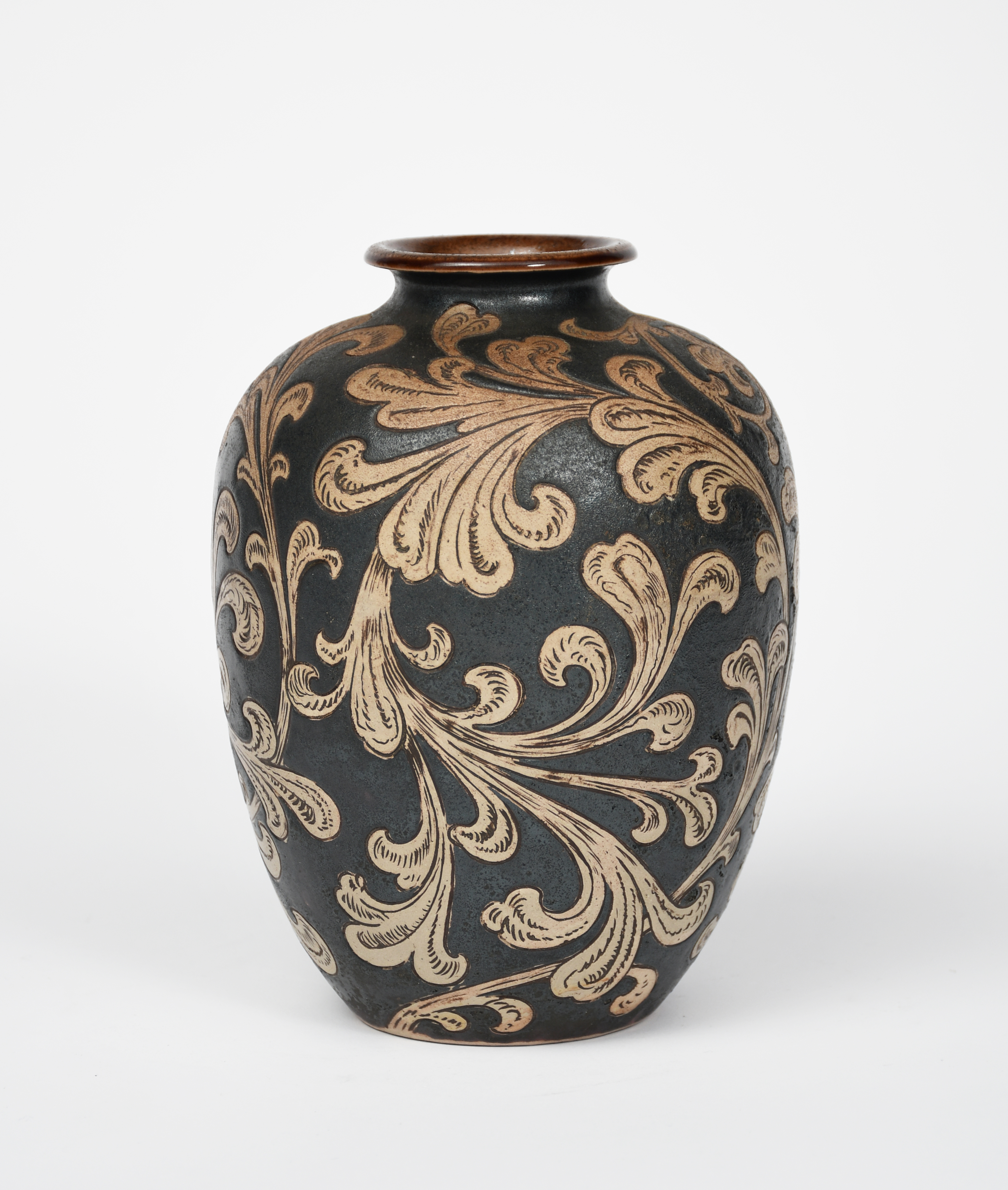 A Martin Brothers stoneware vase, shouldered form, incised with scrolling foliage in buff on a brown ground, incised indistinct date Martin Bros London & Southall, 19.5cm. high