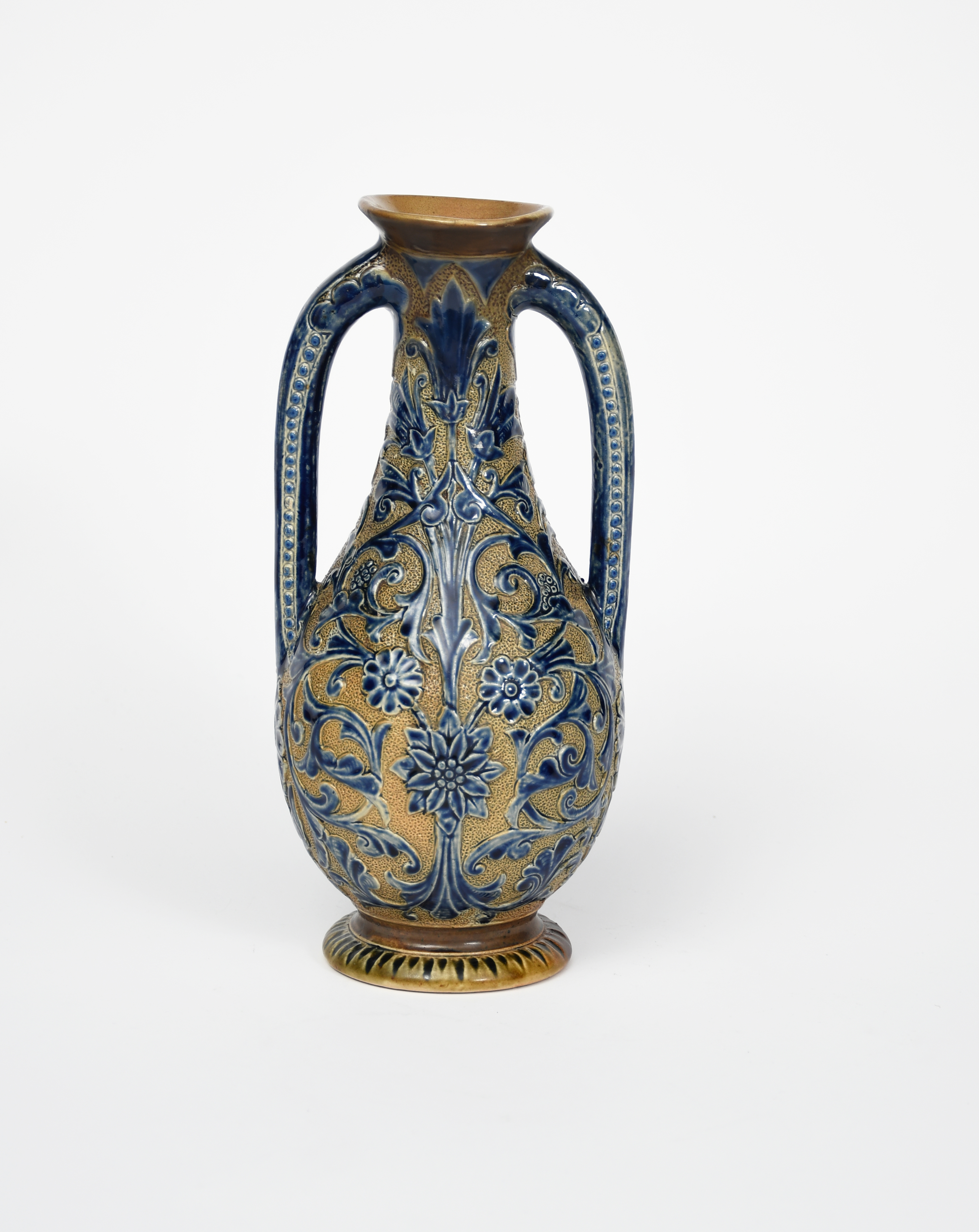A Martin Brothers stoneware twin-vase by Robert Wallace Martin, incised with scrolling foliage on a textured ground, in blue on a buff ground, incised R W Martin London & Southall, restored neck, 26cm. high