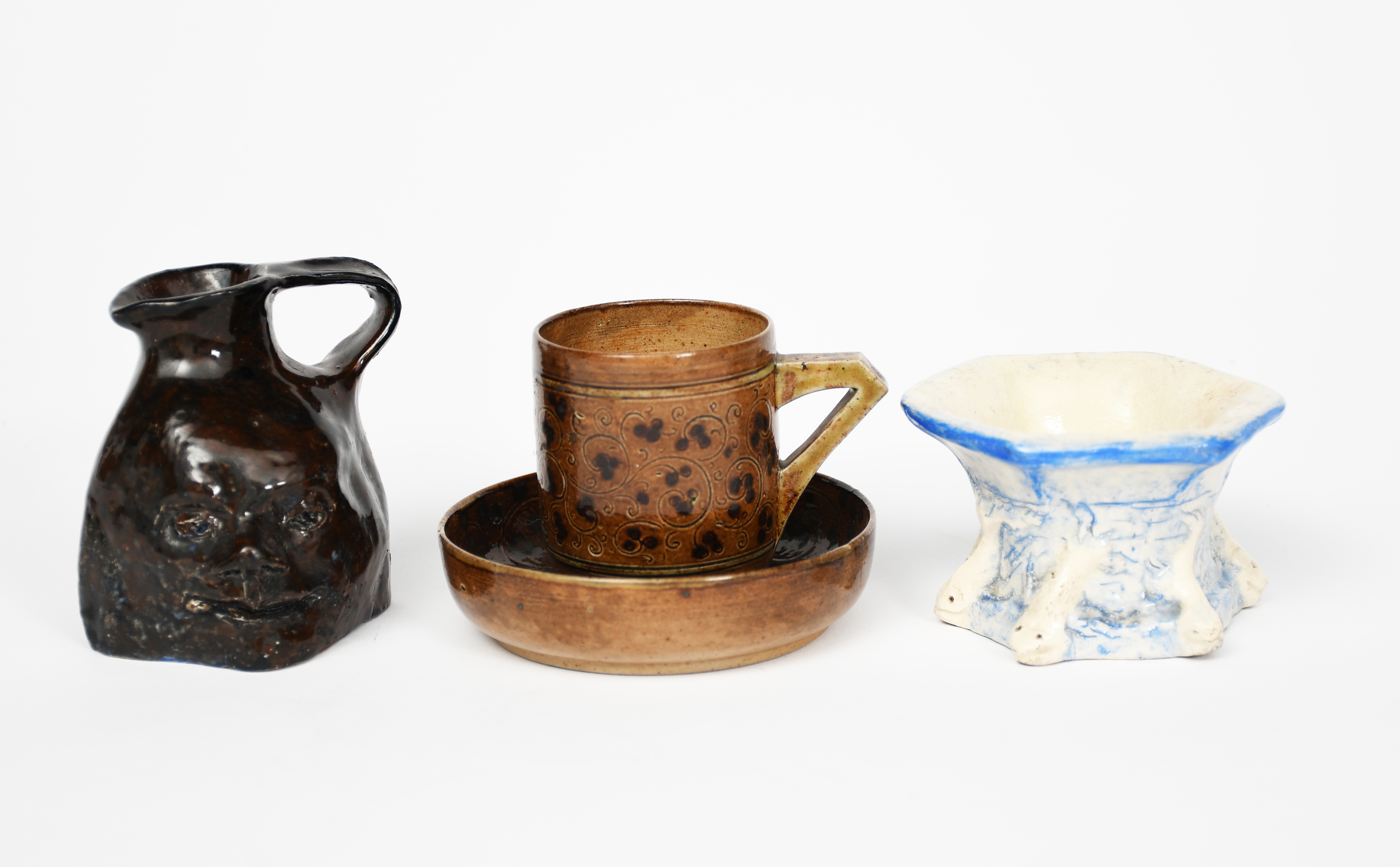 A Martin Brothers stoneware cup and saucer, incised with scrolling foliage in brown on a brown ground, with the crest for the Henderson Clan, in white, and two modern pieces inspired by the Martin Brothers, incised marks, restored chips to saucer 8cm. diam. (4)