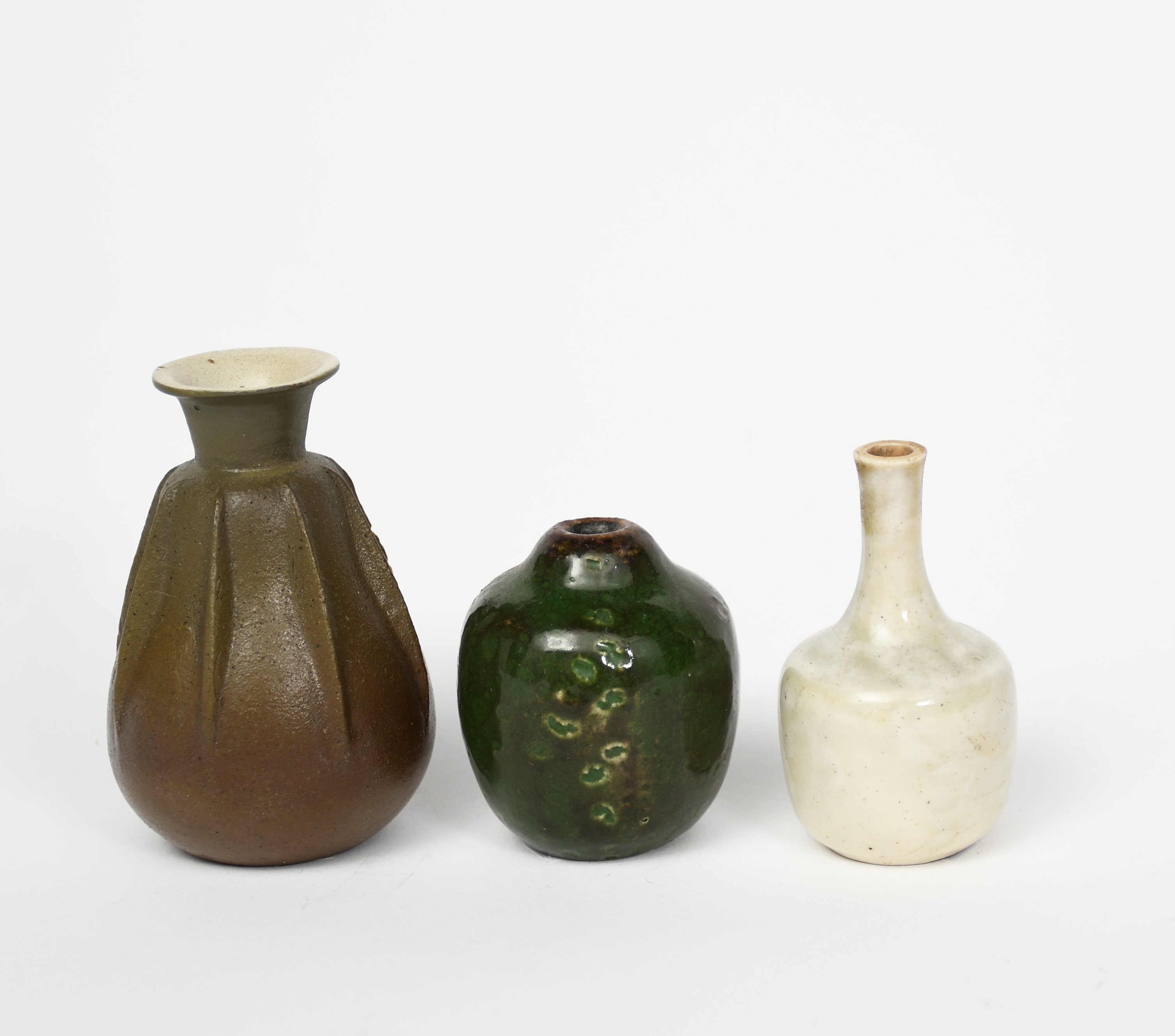 A Martin Brothers stoneware miniature Gourd vase by Edwin and Walter Martin, dated 1906, ovoid form covered in a mottled green and brown glaze, and two other miniature gourd vases, incised 1906 Martin Bros London & Southall, tallest vase restored, 4.5cm. high (3)