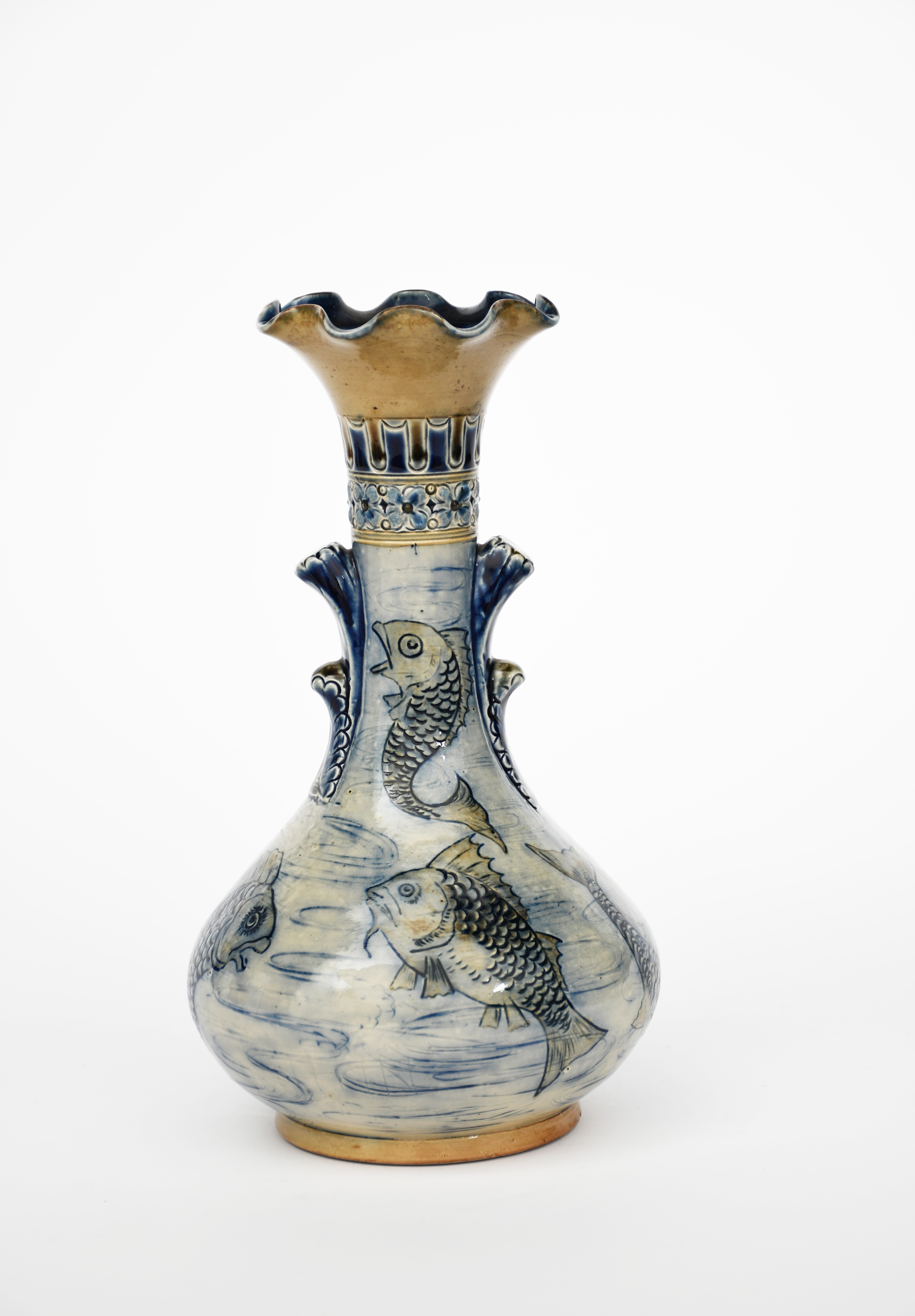 An early Martin Brothers stoneware Aquatic vase by Robert Wallace Martin, dated 1879, tapering form with flaring neck with fluted rim, modelled seaweed lug handles, incised and painted with scaly fish swimming in turbulent water in blue and buff, incised 25 1879, R W Martin London & Southall, minor professional restoration to top rim, 26cm. high