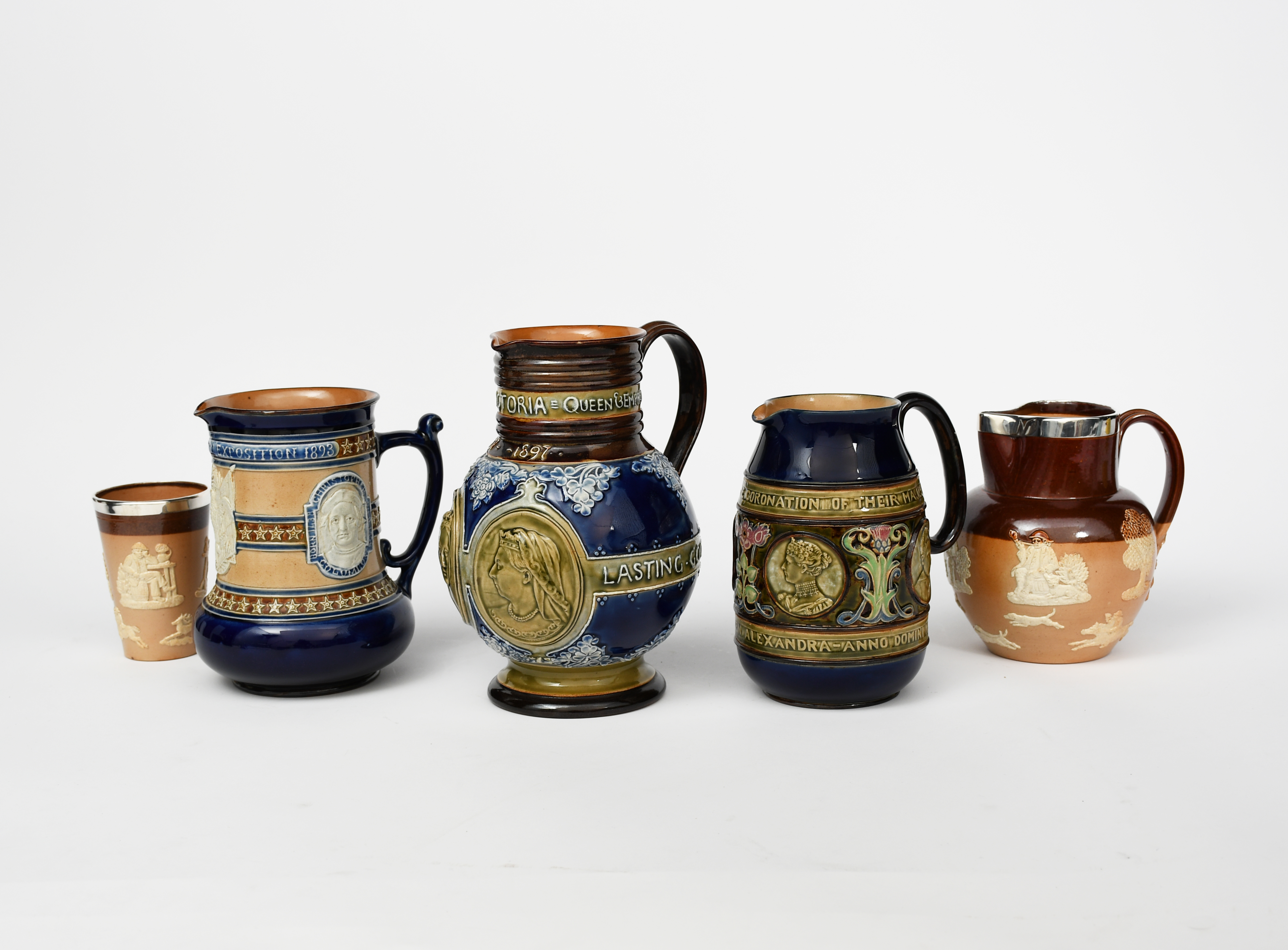 'World's Columbian Exposition 1893' a Doulton Lambeth stoneware commemorative jug by Bessie Newberry, cylindrical form with swollen base, applied with portrait's of George Washington and Christopher Columbus flanking the American Eagle, between applied bands of star decoration, in blue and brown on a buff ground, a Doulton Lambeth Queen Victoria 1837-1897 commemorative jug, a Royal Doulton Lambeth Edward VII Coronation jug a Doulton sprigged water-jug and beaker, impressed marks, incised artists marks, 18.5cm. high (Exposition jug), (5)