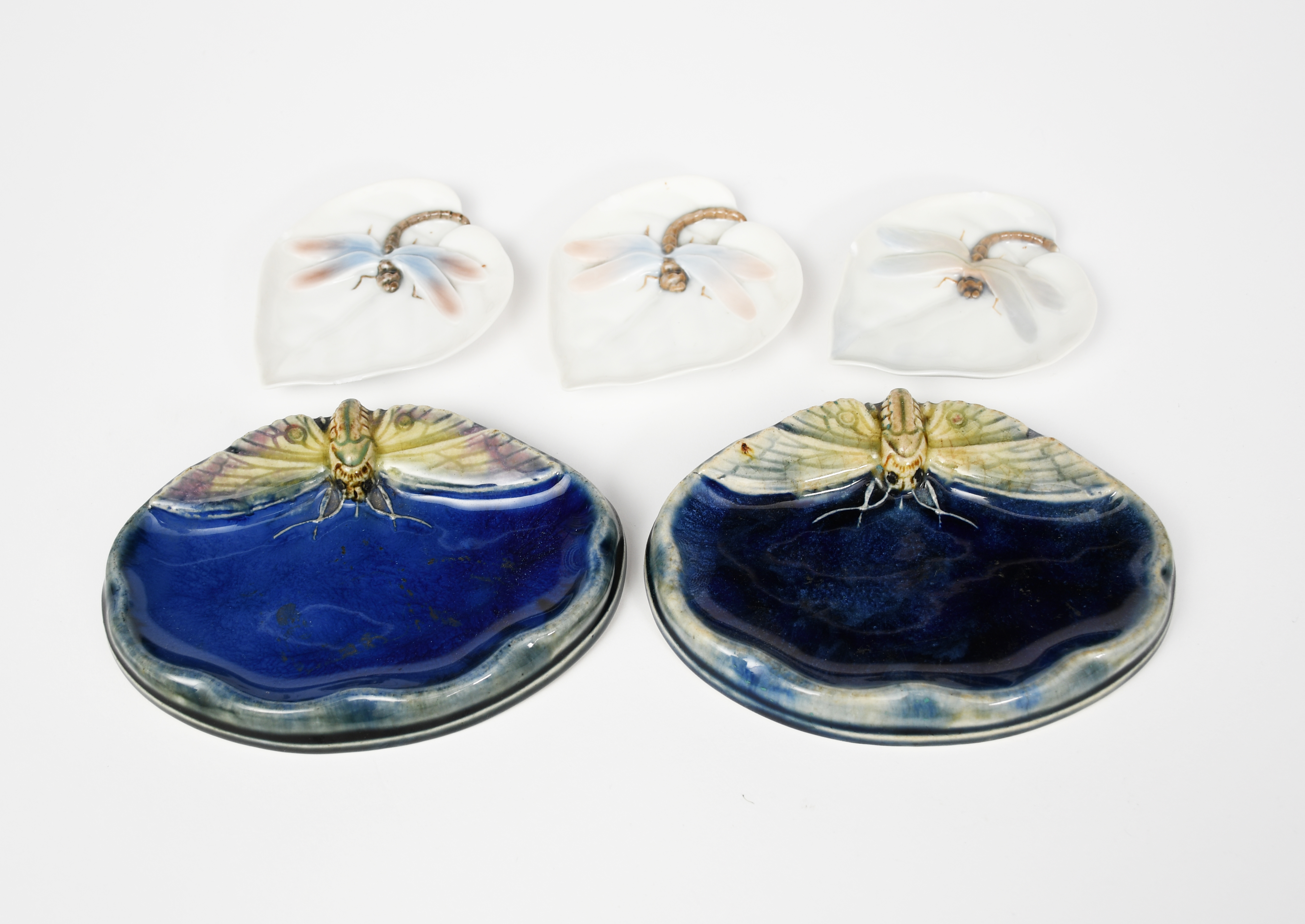 A Doulton Lambeth stoneware Butterfly pin tray designed by Harry Simeon, modelled in relief with a butterfly resting on an oval tray, glazed in colours, another similar and three Bing & Grondahl dishes decorated with dragonflies, impressed marks, chips to Bing & Grondahl dishes, 14cm. wide (Doulton dishes), (5)