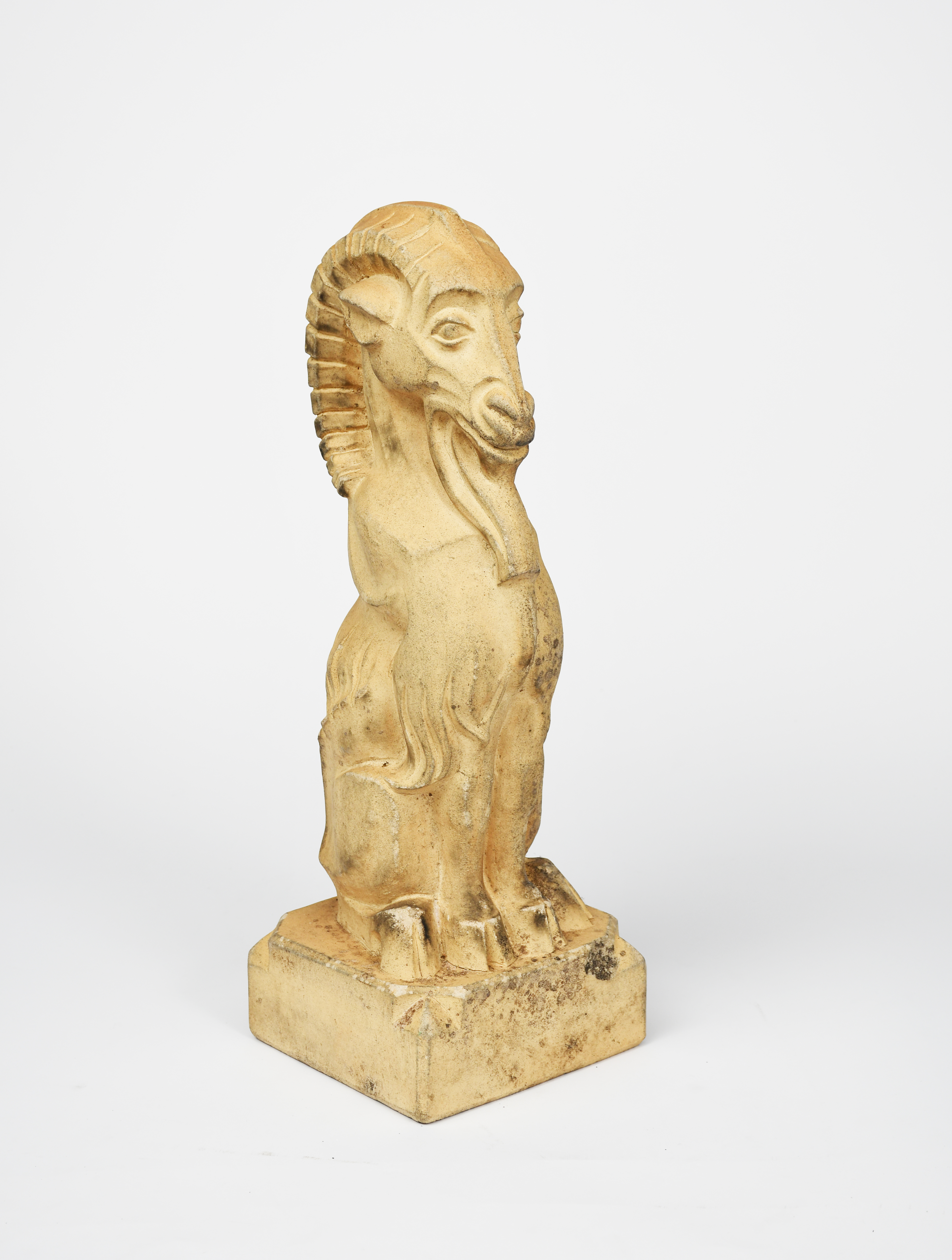 A Royal Doulton stoneware figure of a goat designed by Francis Pope, modelled seated on square plinth, impressed Doulton mark, minor losses, 50cm. high