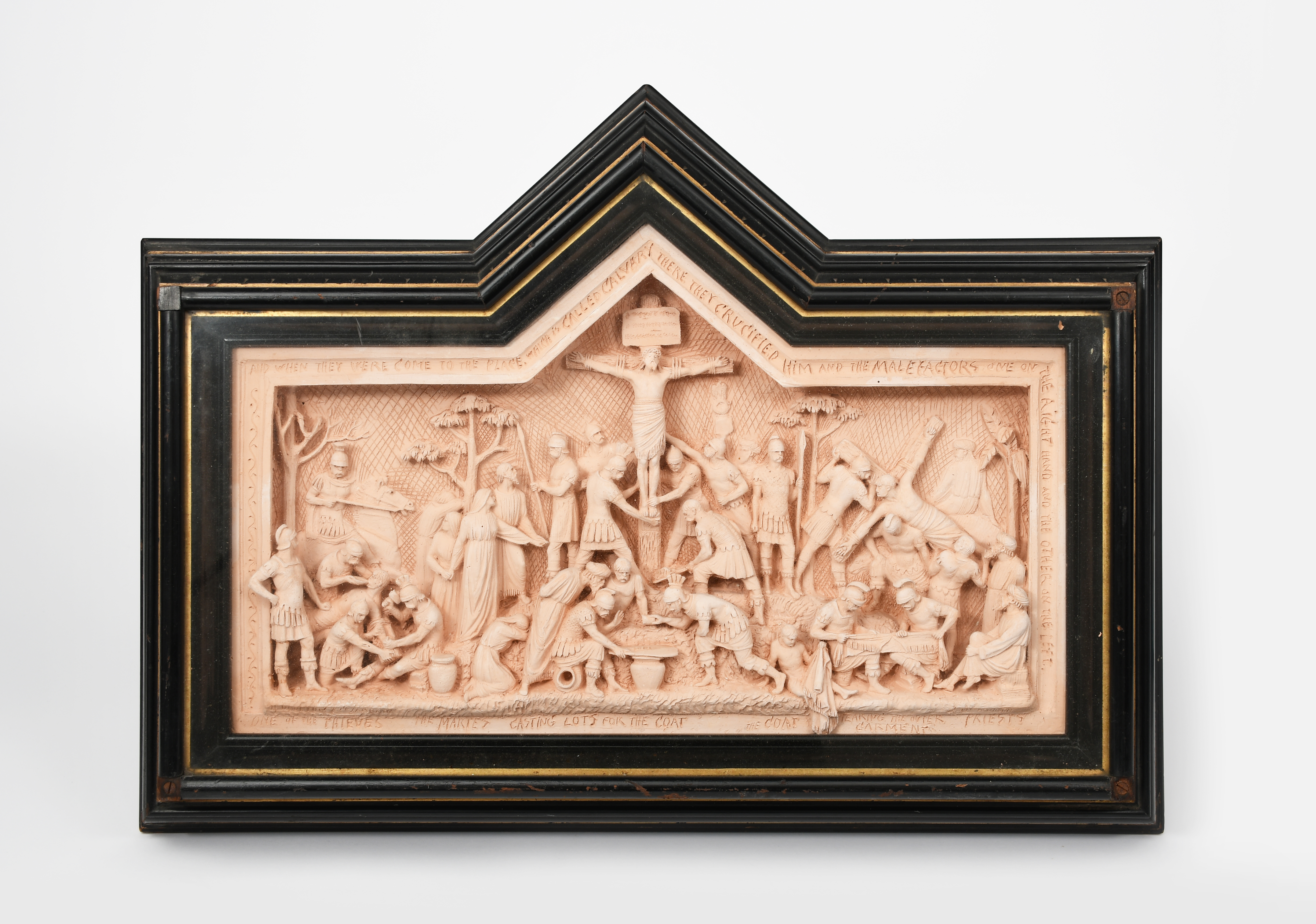 A large Doulton Lambeth terracotta maquette for York Minster by George Tinworth, shaped, rectangular panel, modelled with the Crucifixion of Christ, with white highlighter, incised inscription to border, in original ebonised wood frame with gilt, factory marks probably concealed under frame, 52 x 33cm.