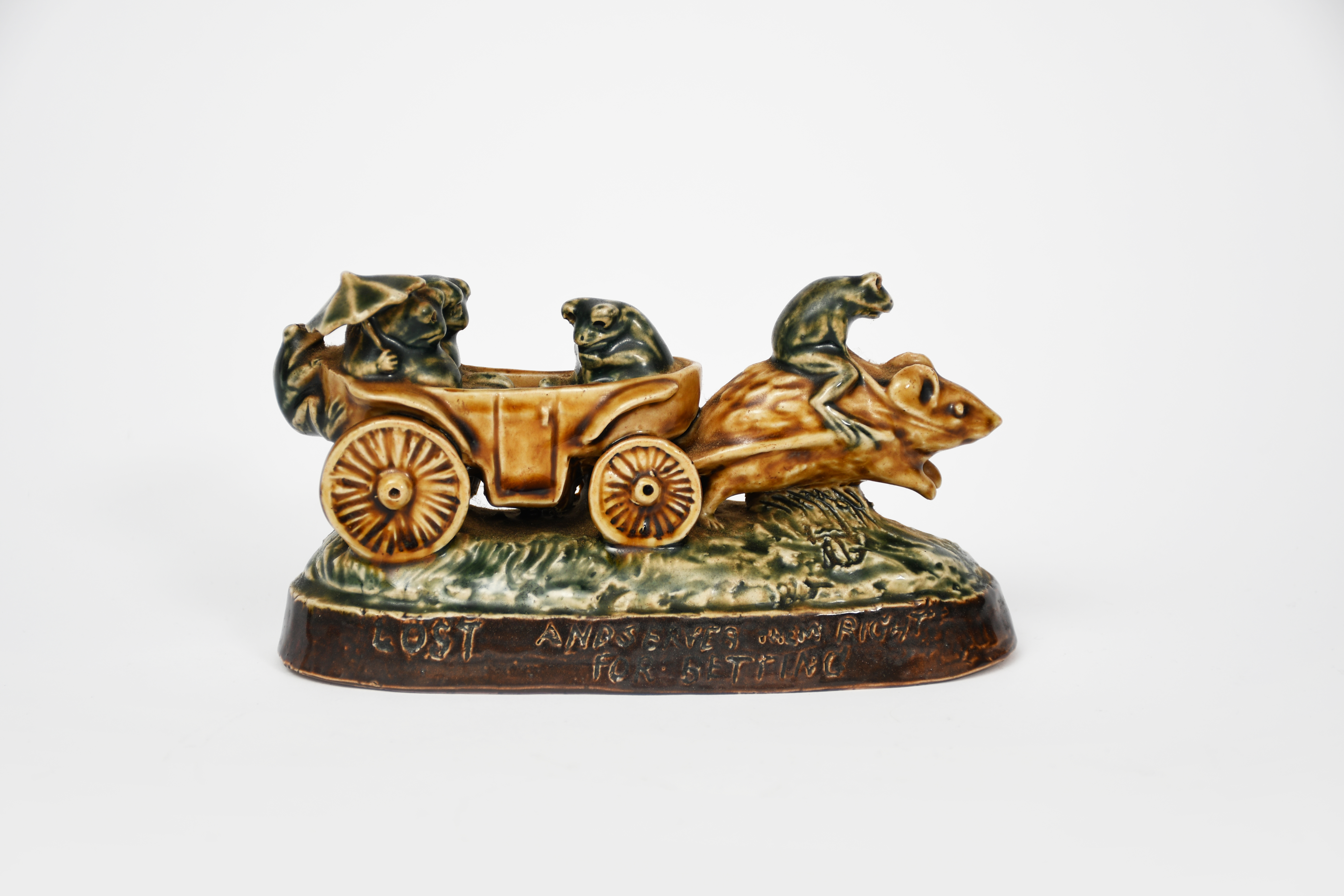 Lost and Serves them Right for Betting (Returning from the Derby) a Doulton stoneware mouse and frog group by George Tinworth, modelled as a large mouse pulling a carriage with four frogs in, a large frog riding the mouse, incised to the base rim 'Lost and serves them right for betting', glazed green, buff and brown, incised GT monogram, signpost off and missing, 15.3cm. wide
