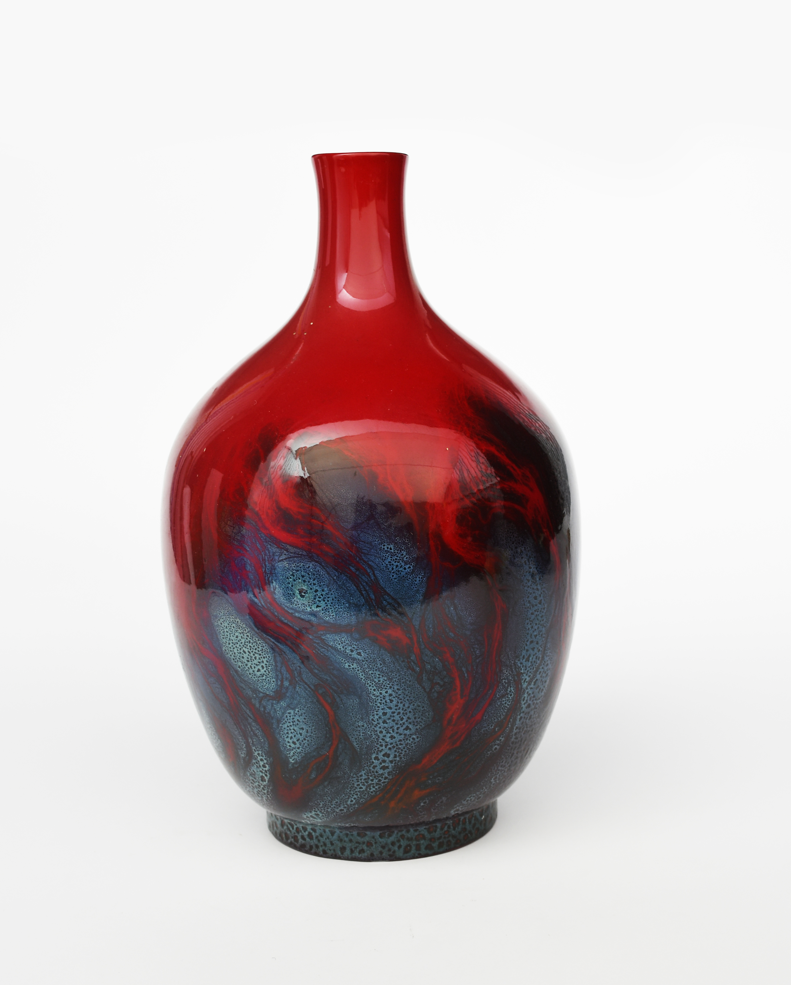 A large Doulton Flambe Veined vase, model no.1624, ovoid with cylindrical neck, covered in a flambe vase, the base with smoked, blue and lavender smoked glaze, printed factory mark, 44cm. high