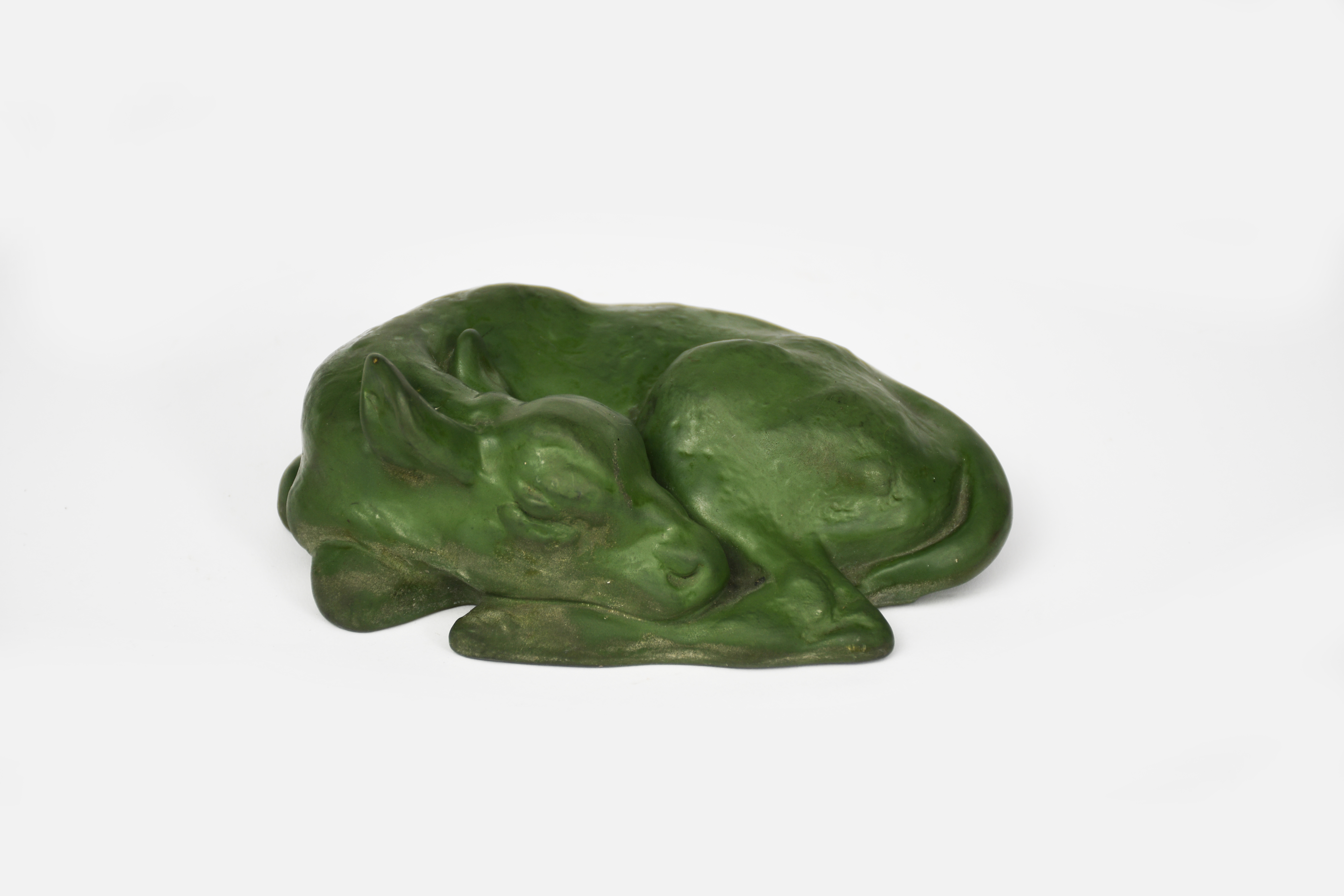 'Sleeping Calf' a rare Royal Doulton animal figure designed by Raoh Schorr, model no. 946, covered in a green bronze glaze printed factory mark, impressed marks, 14cm. wide.