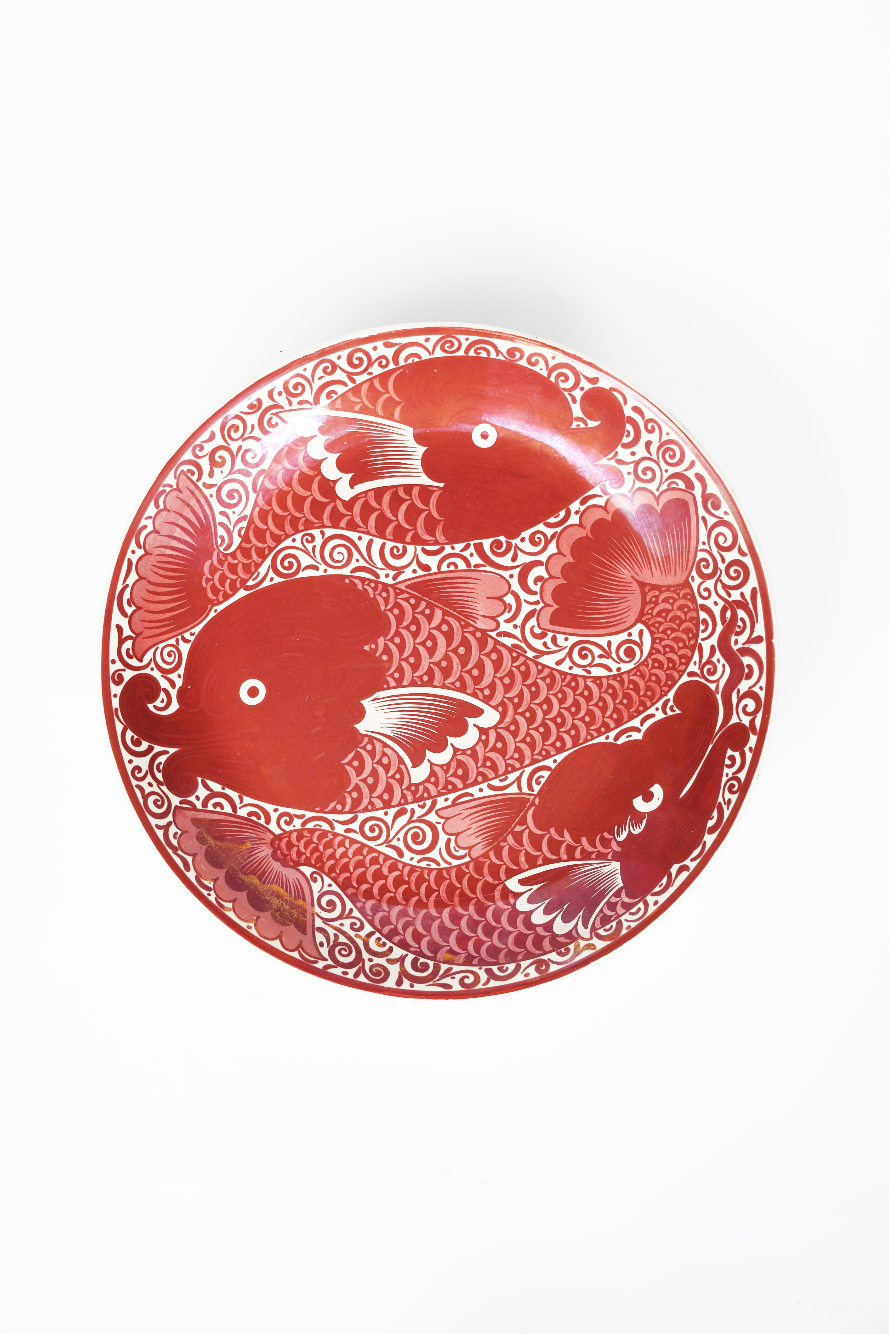 A William De Morgan charger by Fred Passenger, painted with three comical scaly fish, swimming amidst scrolling water-weed, in ruby lustre on a white ground, painted FP, monogram, 36cm. diam.