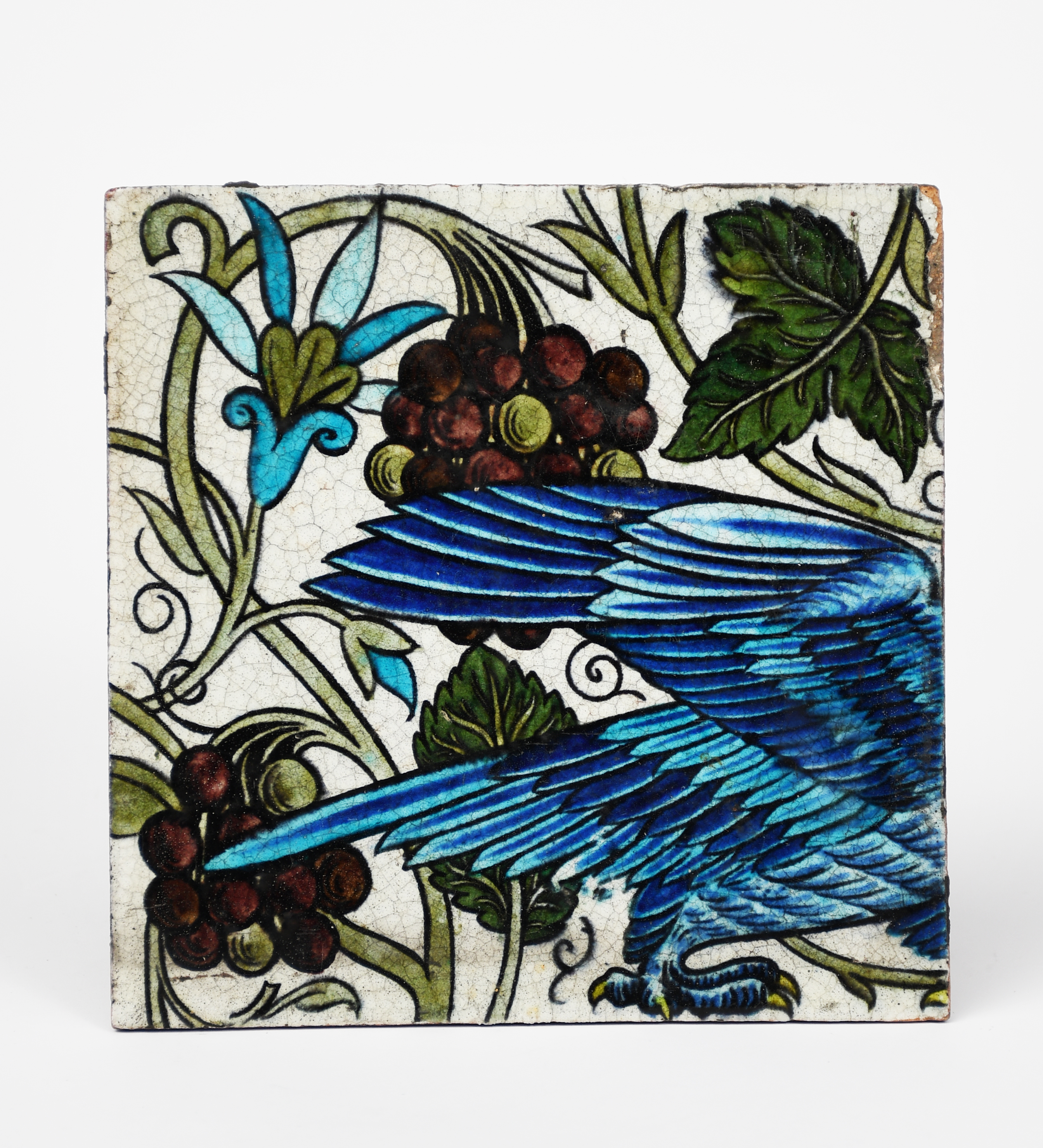 A William De Morgan Persian tile, part of a panel, painted with the rear section of a blue bird, on scrolling vine ground, in shades of blue, turquoise, aubergine and green on a white ground, impressed factory mark, 20.5cm. square