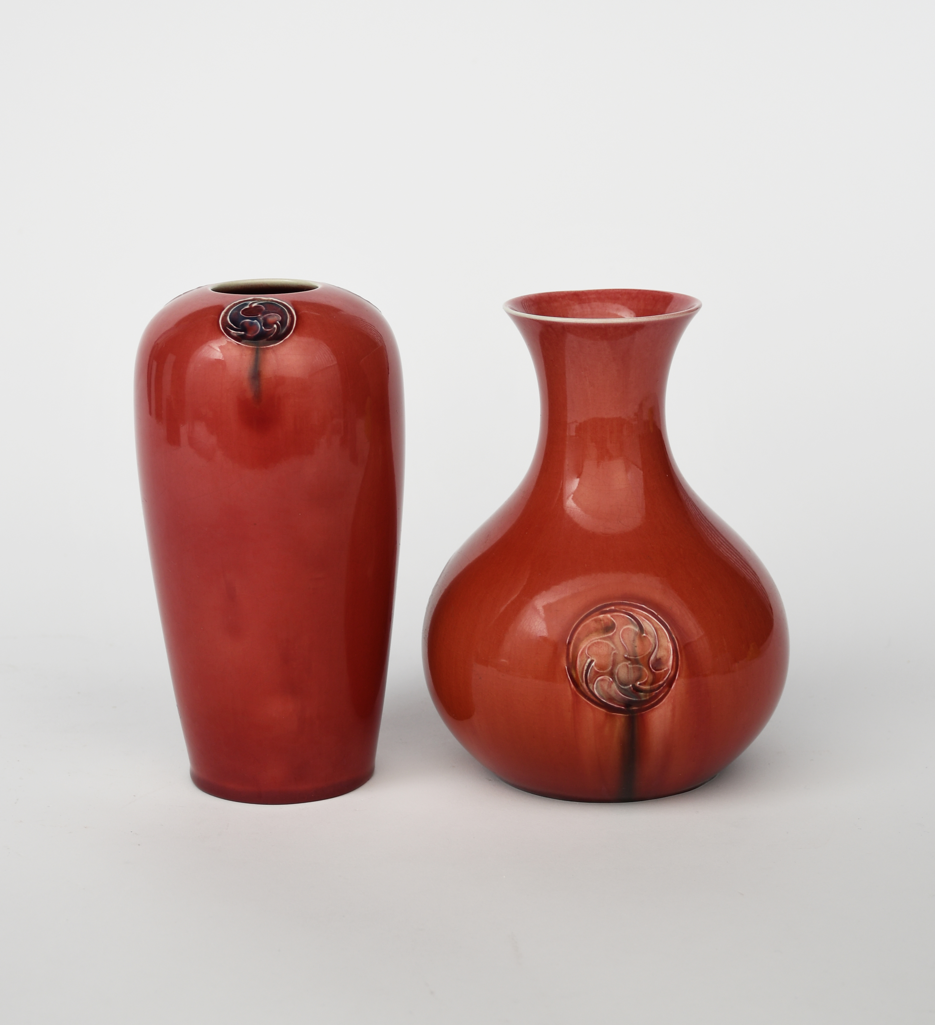A Moorcroft Pottery Flamminian Ware vase designed by William Moorcroft, made for retail at Liberty & Co, tubeline decorated with an Art Nouveau roundel in blue on a flambe red ground, and another Moorcroft Pottery Flamminian Ware vase, incised signature, printed factory mark, 19.5cm. high (2)