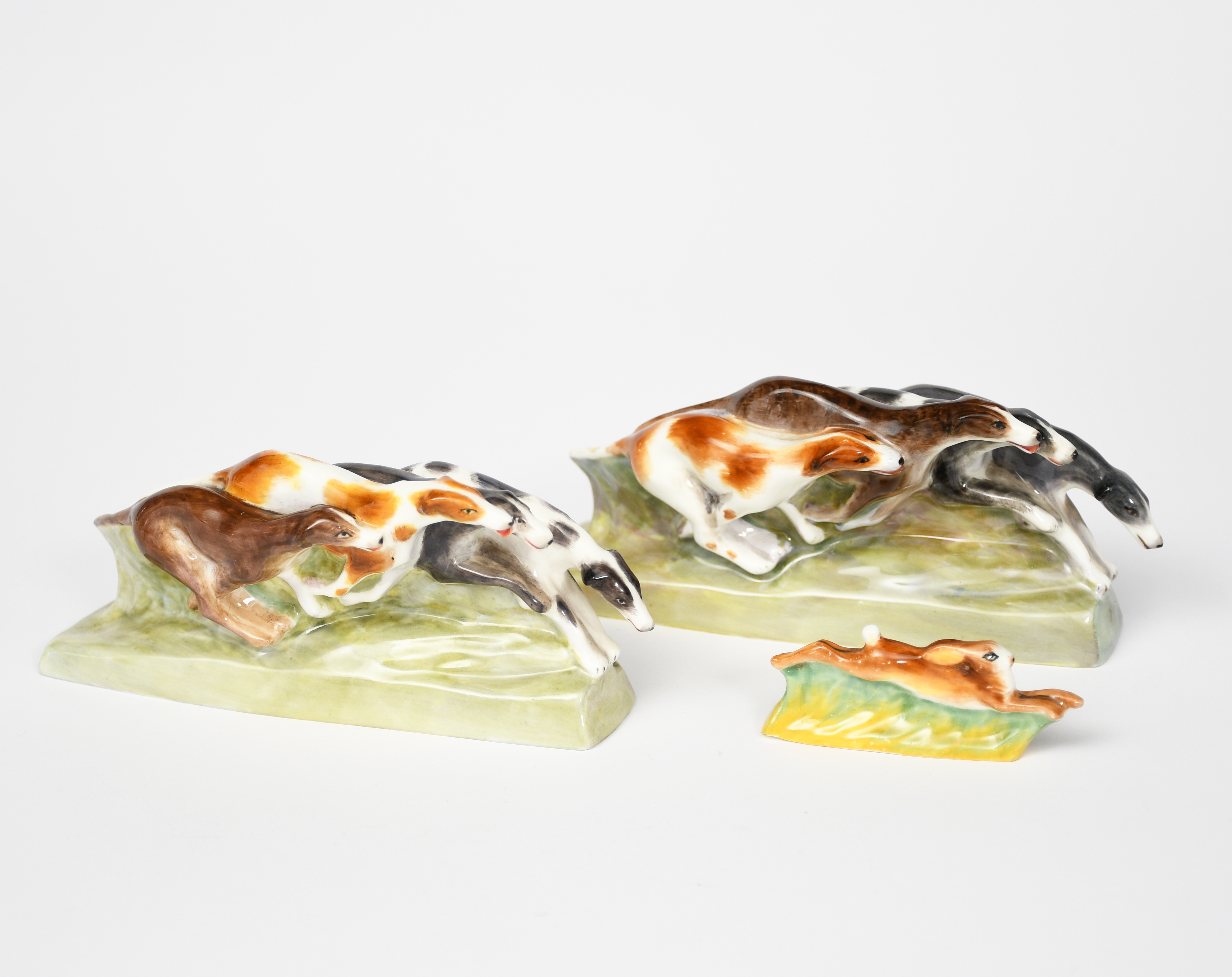 two Royal Worcester greyhound figure groups, model no.2891/1 and 2891/2, and a hare no. 2892, glazed in colours