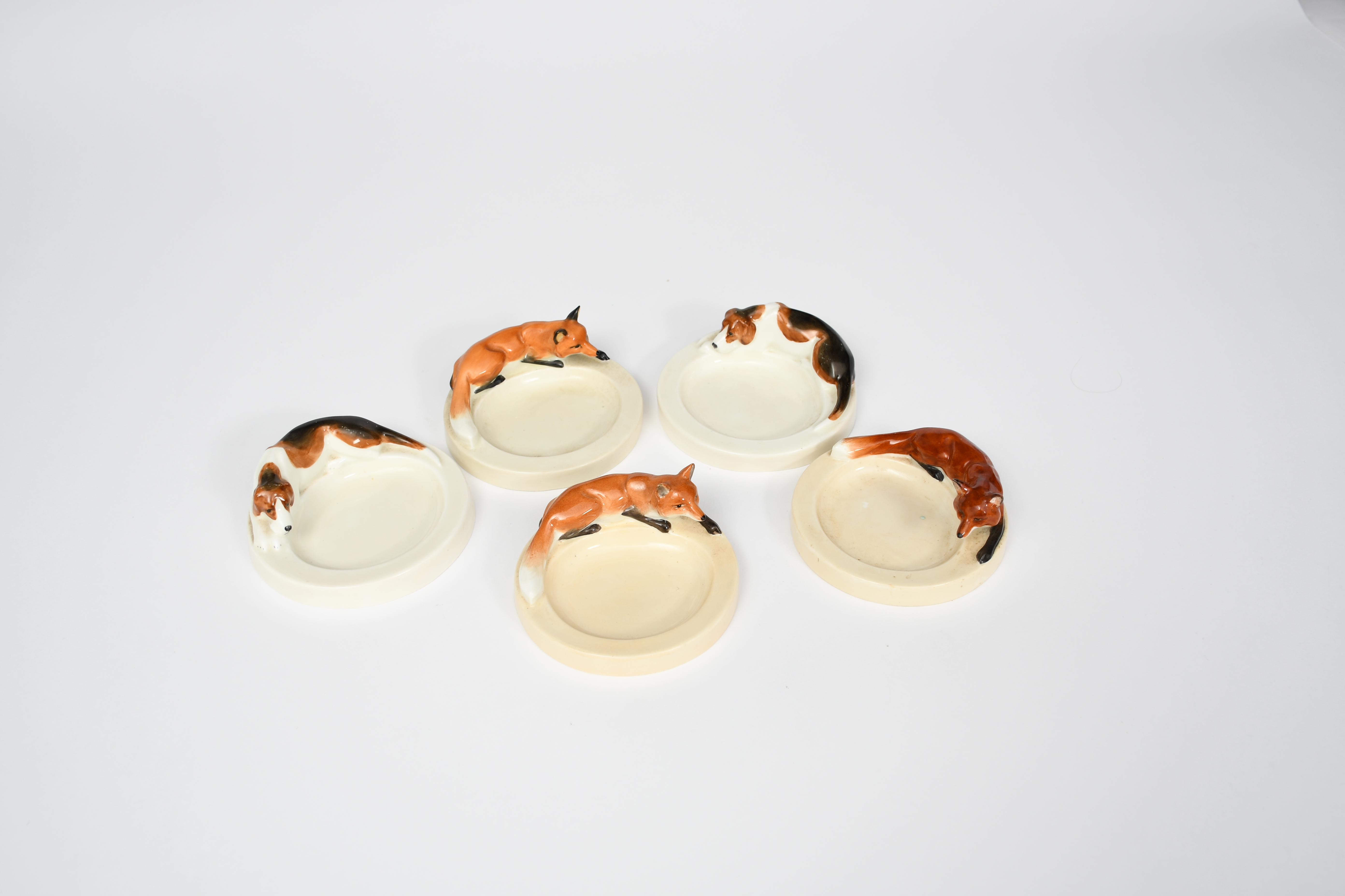 five Royal Worcester dishes, comprising three fox and two hound dishes, glazed in colours