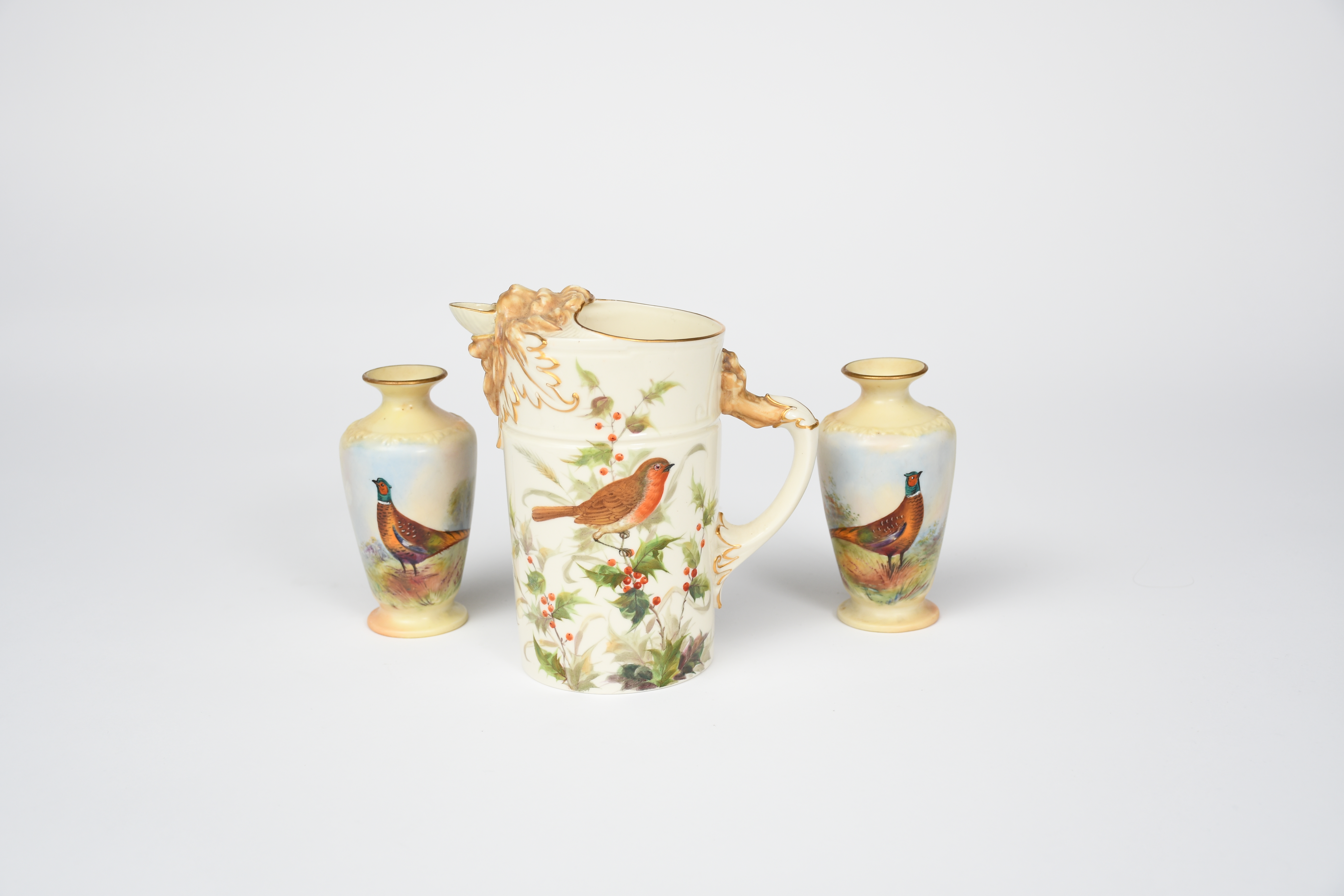 A Royal Worcester jug, cylindrical form the spout cast as a lion head, the cylindrical body printed with a robin perched in berried holly, in colours, and a pair of Locke & Co, Worcester vases printed with pheasants, printed factory mark, 17cm. high, (3)