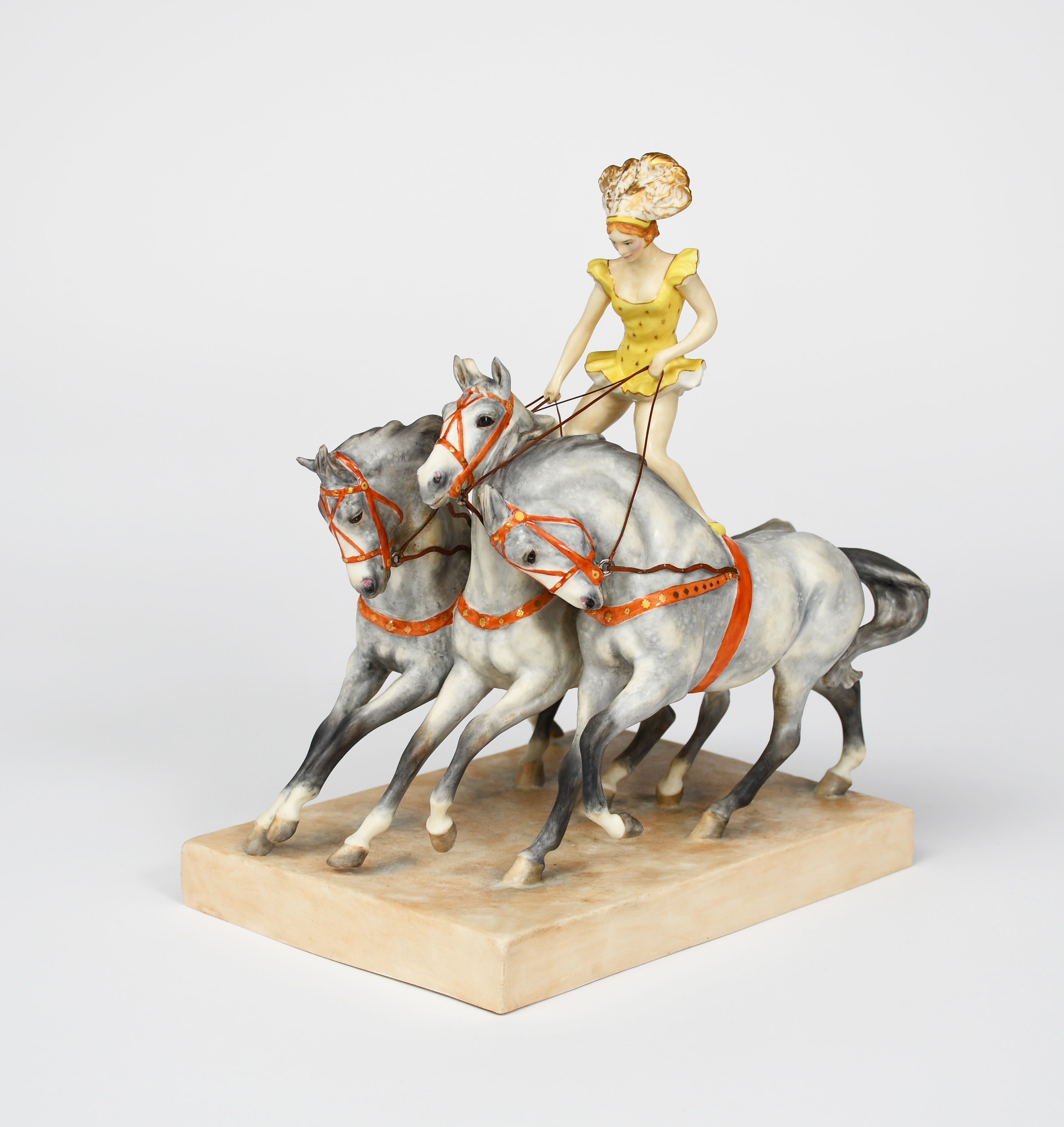 This figures depicts the Bertram Mills Circus which performed in 1935 at Olympia. Milly Yelding performed the Courier of St Petersburg act with nine stallions in the 1934-35 Olympia act.