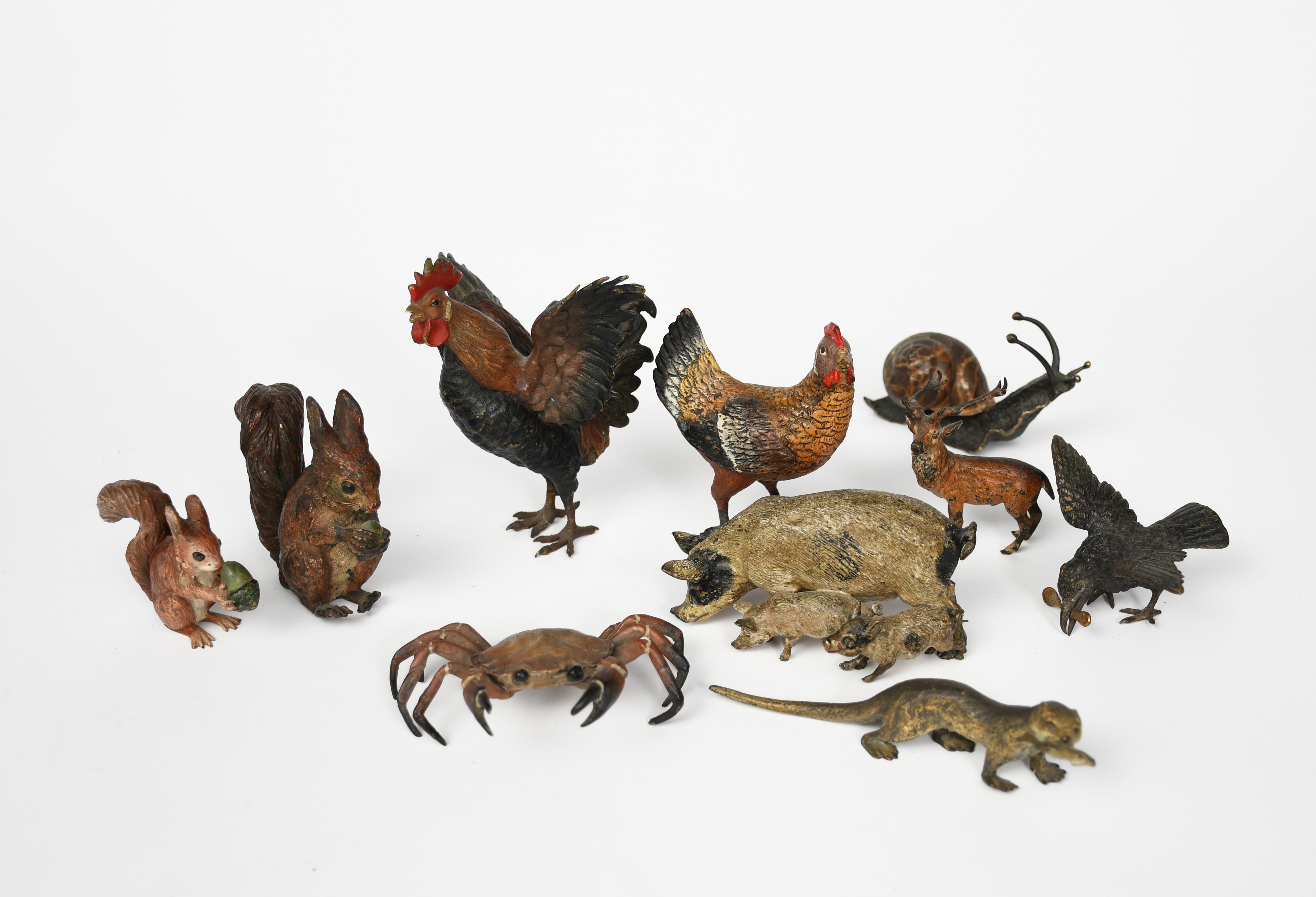 A cold painted bronze model of a chicken, modelled raising its wings, another modelled standing, a cold painted bronze model of an otter with a fish in its mouth, a cold painted bronze model of family of pigs, two red squirrels, a stag, a crow with a gold spoon in its beak, a crab and a snail, unsigned, 11.5cm. high (chicken), (10)