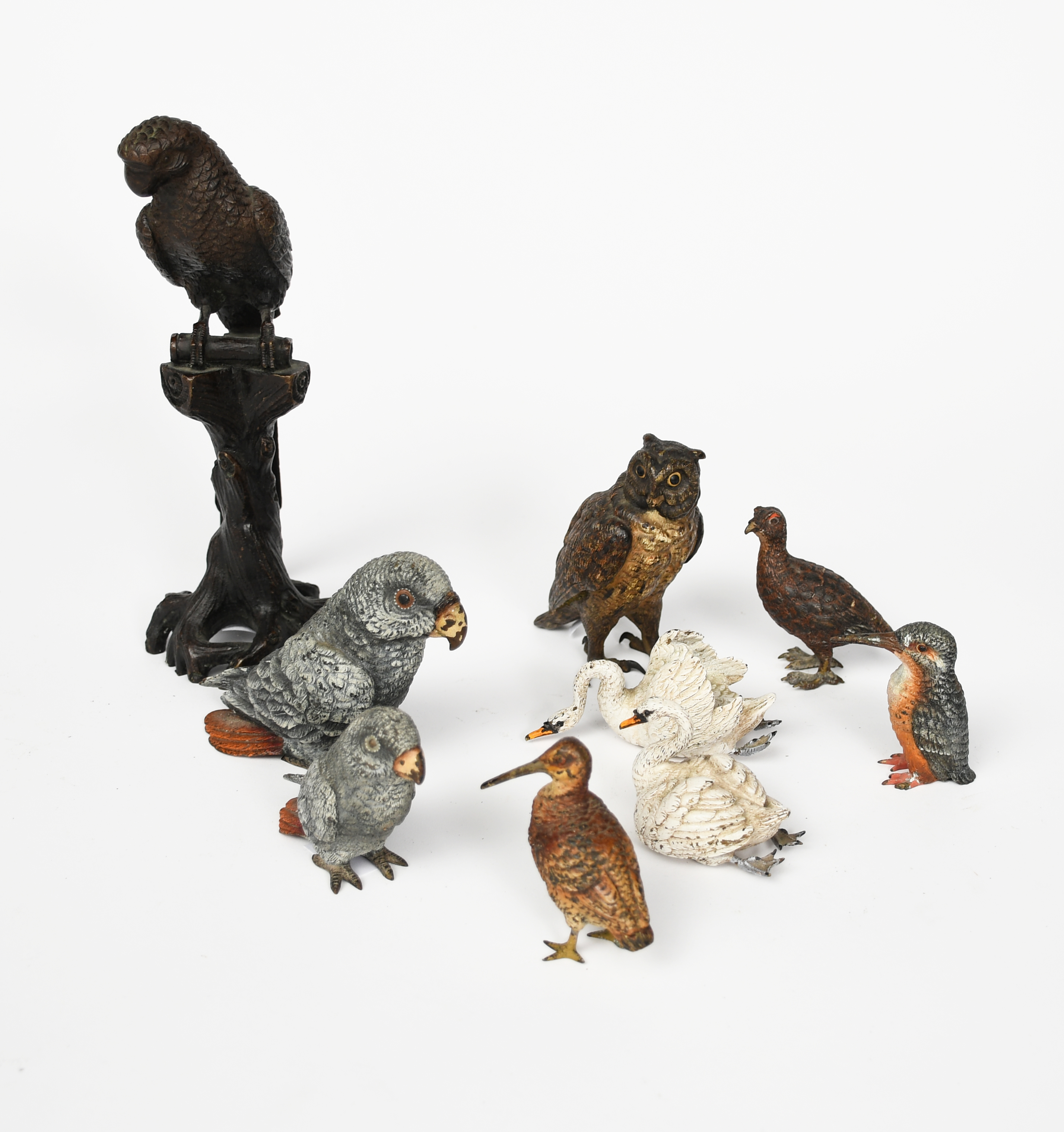 A cold painted bronze model of an owl, modelled standing, two cold painted bronze models of Grey parrots, a Kingfisher, a woodcock, a grouse and two swans, and a modern model of a parrot perched on a tree stump, unsigned, 9cm. high (owl), (9)