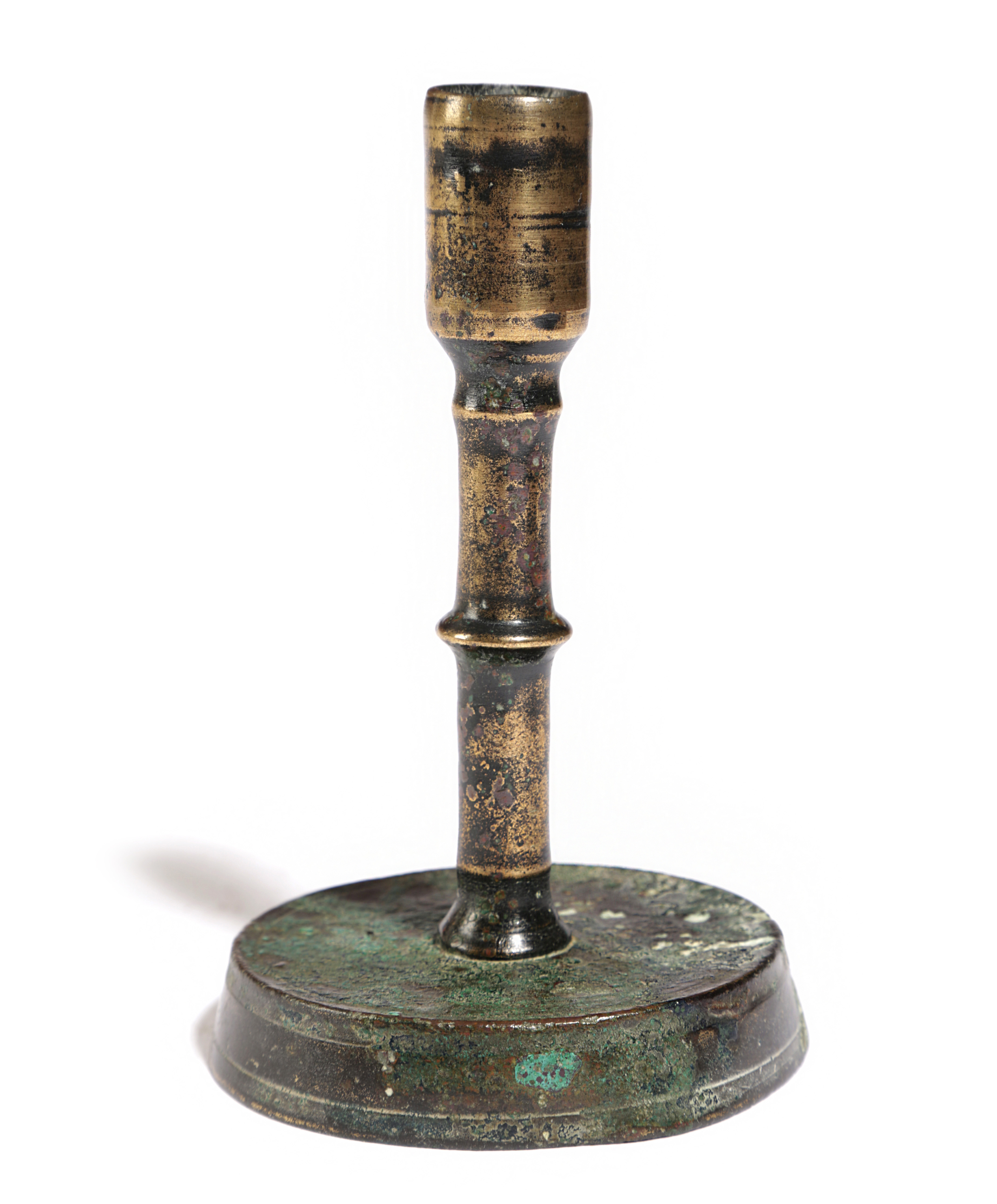 A RARE ENGLISH COPPER ALLOY OR LATTEN CANDLESTICK