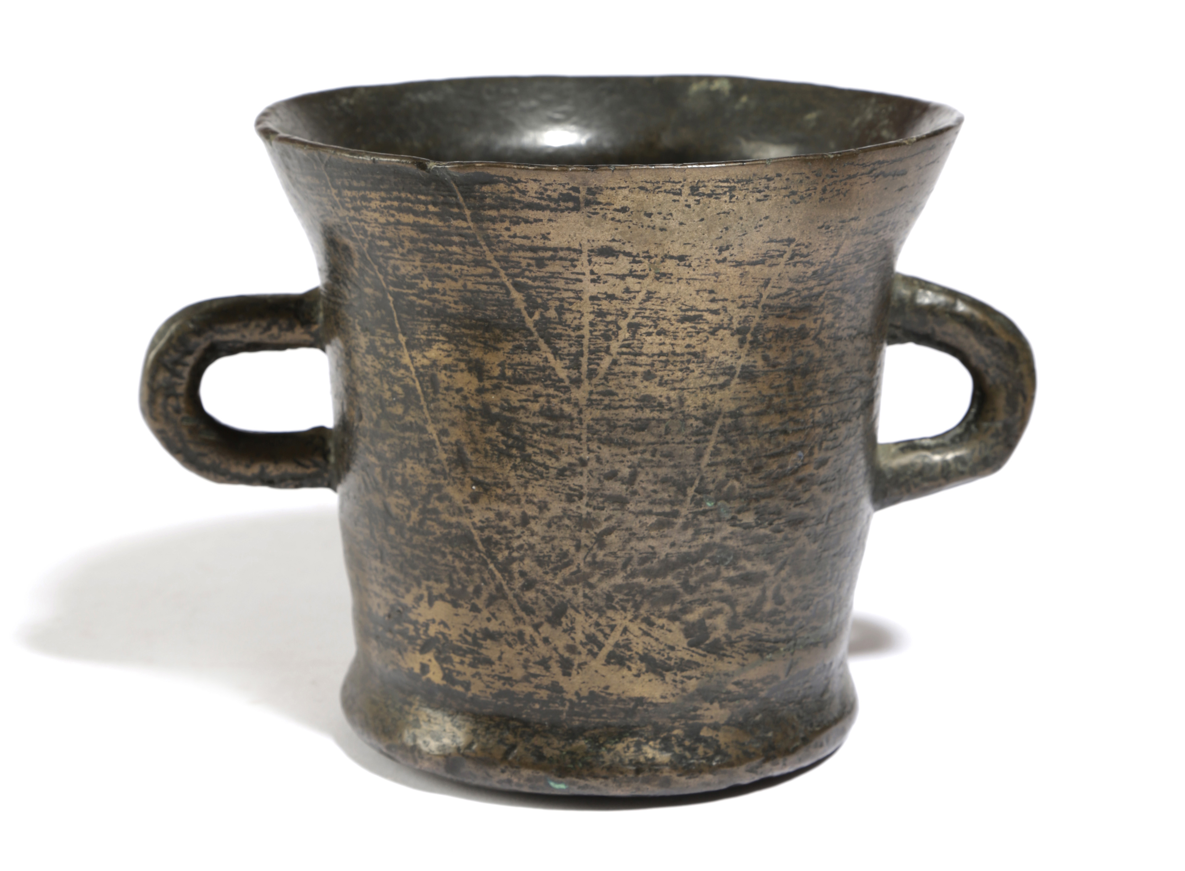 of flaring form with two lug handles, with a slightly spreading foot and arrow head decoration to each side