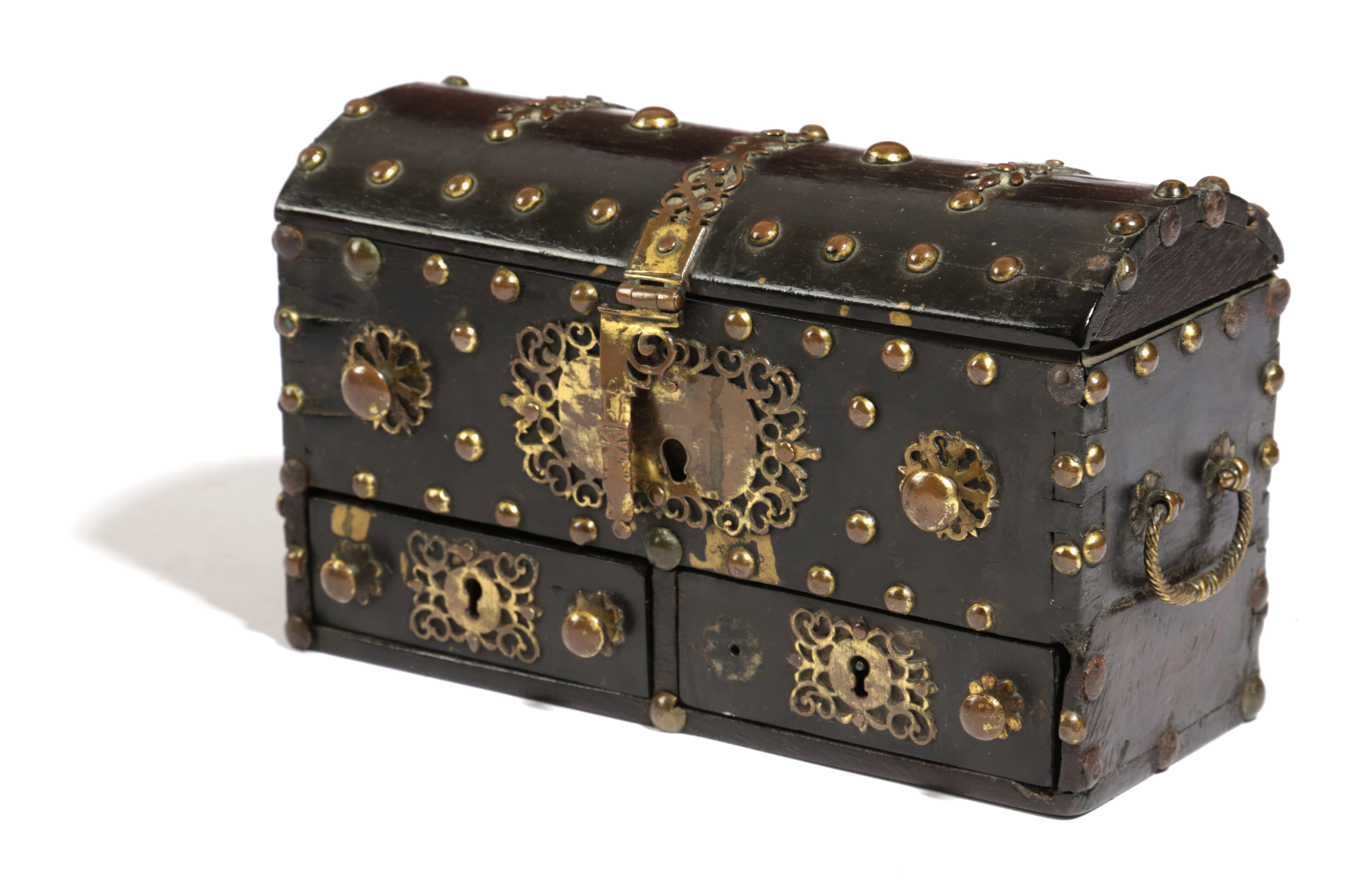 of domed form, the hinged cover enclosing a vacant interior, above a pair of short drawers, applied with fret cut hinges, escutcheons and handles, with rope twist carrying handles