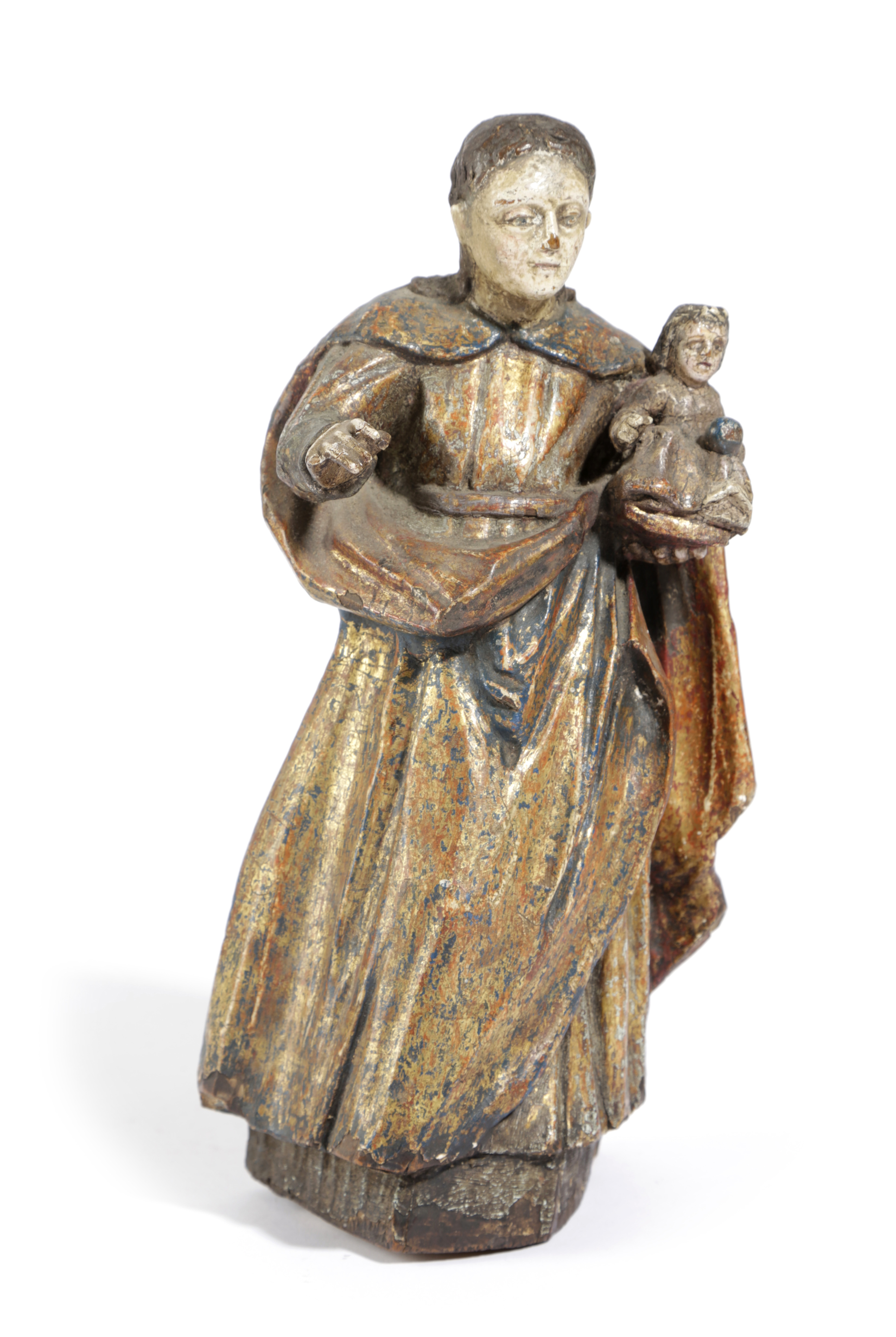 A CONTINENTAL CARVED WOOD MADONNA AND CHILD